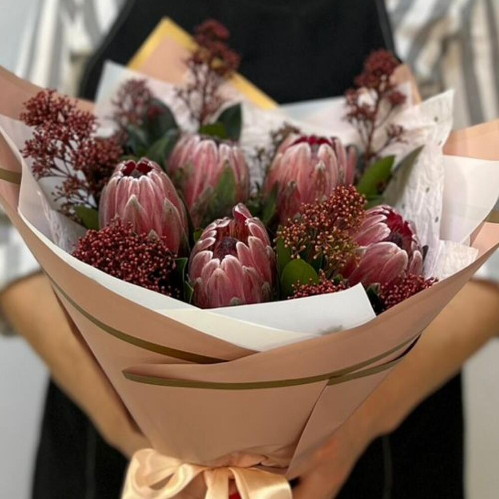 Прекрасный, экзотический и очень стойкий букет из протеи и скимии! Отлично подойдёт для коллеги, и близкого человека. Букет хорошо смотрится в качестве основного подарка, и может быть как дополнение к основному подарку.