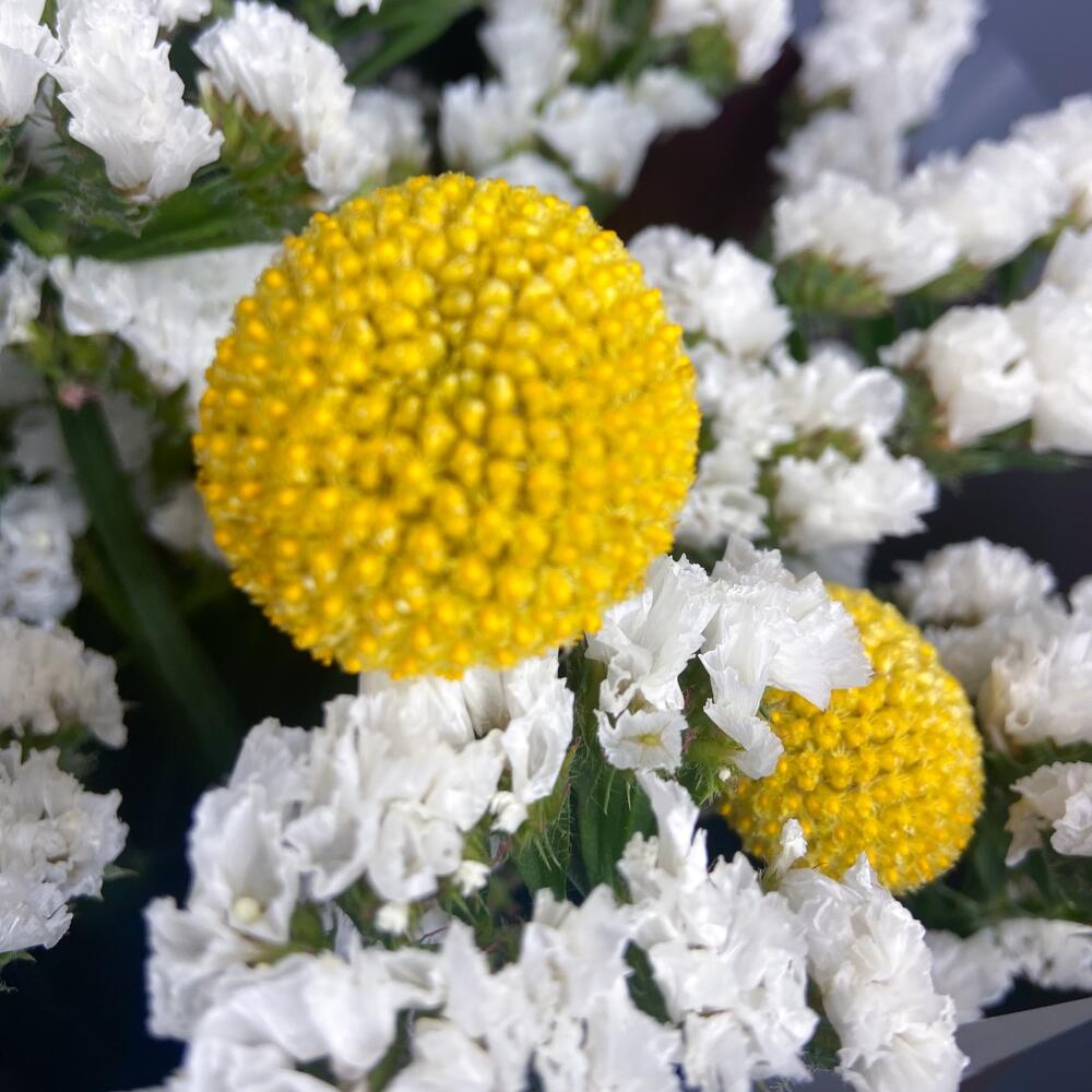 Невероятно стойкий и необычный букет из экзотического сафари,невероятно стойкий белой статица и милыми желтыми шариками краспедии-удивит и восхитит свою получательницу!