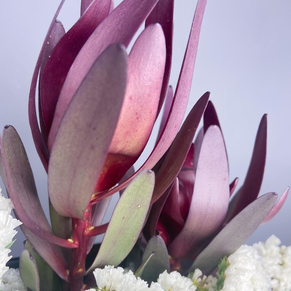 Упаковка – 1 шт.Статица белая – 3 шт.Краспедия желтая – 3 шт.Сафари бордовая – 3 шт.