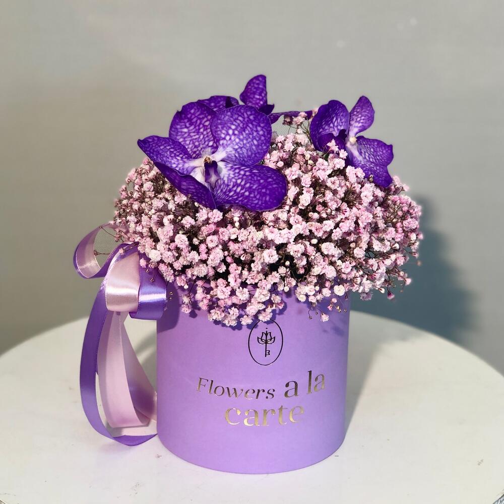 Гипсофила и орхидеи Ванда в коробке M