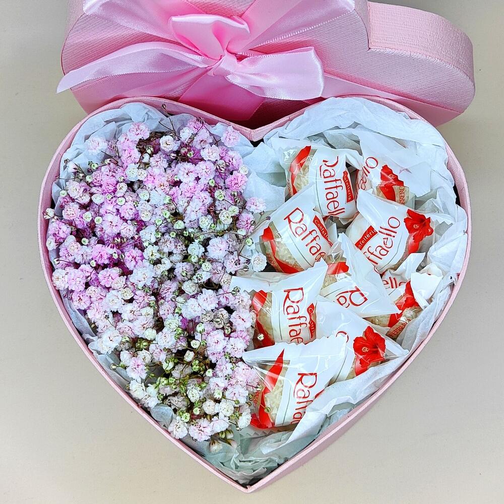 Гипсофила – 2 шт.Коробка сердце – 1 шт.Губка флористическая – 1 шт.Конфеты Raffaello – 9 шт.