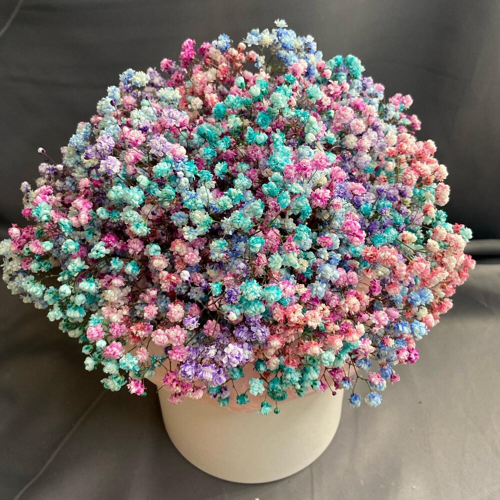 “Сиреневый туман” – композиция из гипсофилы в шляпной коробке