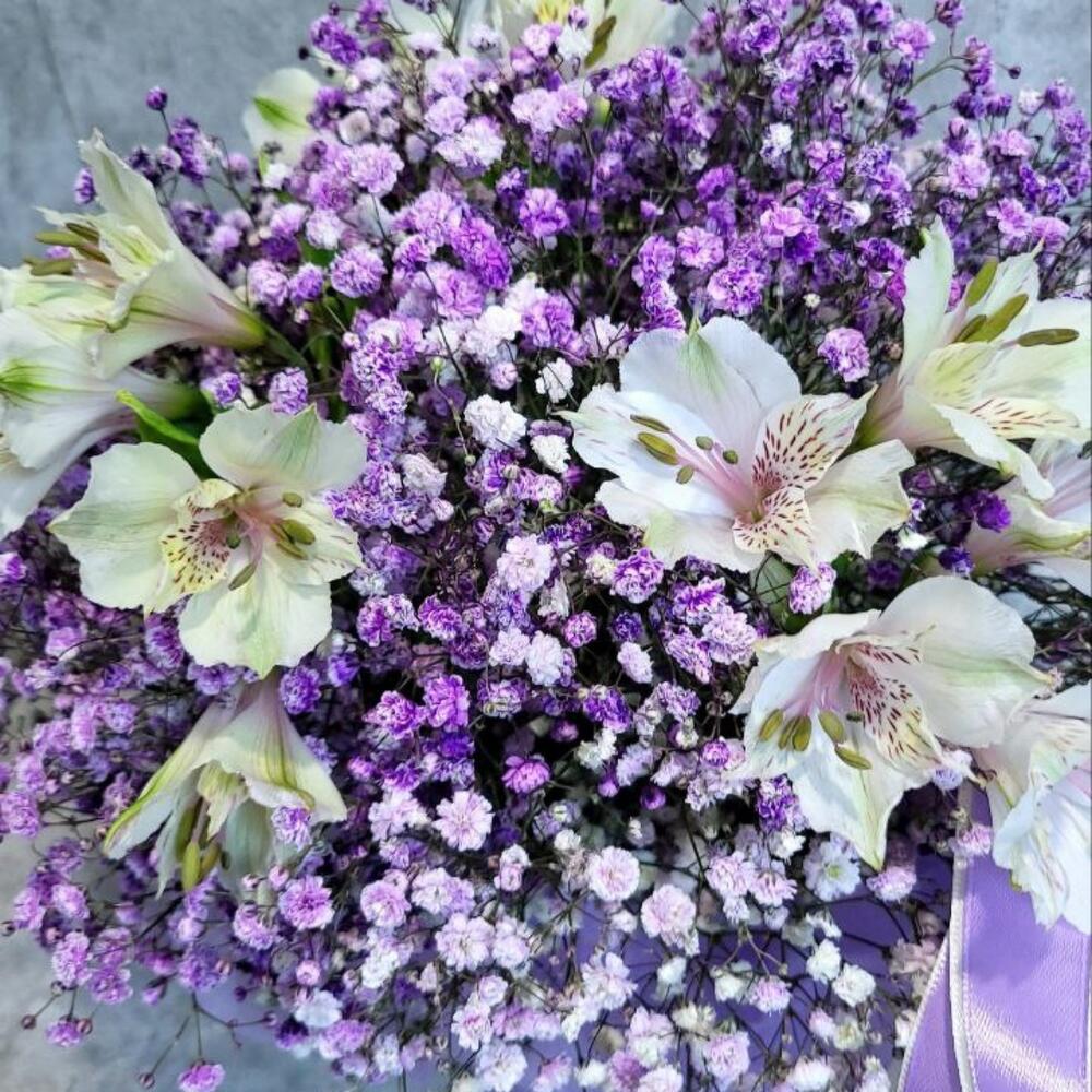 Гипсофила – 5 шт.Альстромерия – 3 шт.Лента атласная – 2 шт.Шляпная коробка – 1 шт.Оазис флористический – 1 шт.