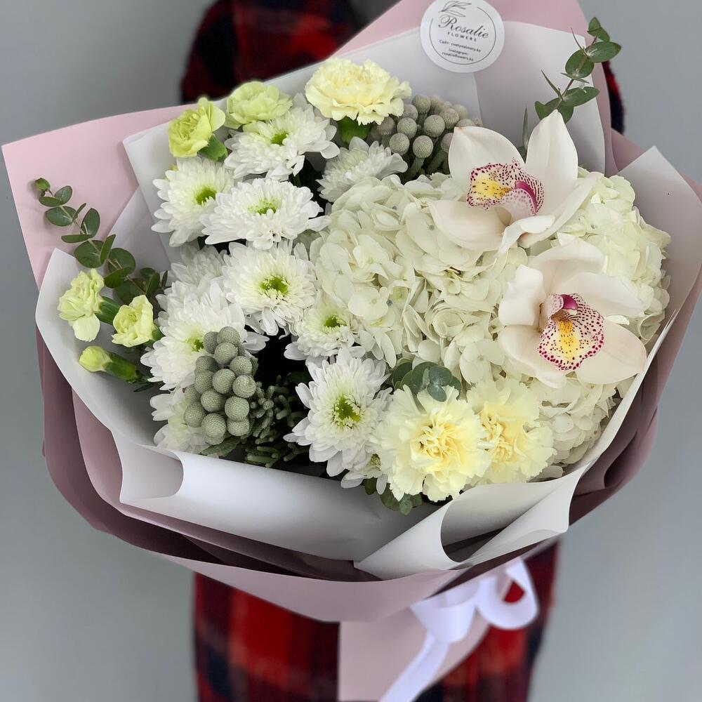 Альстромерии, Гвоздики, Кустовые розы, Лизиантусы, Розы, Хризантемы