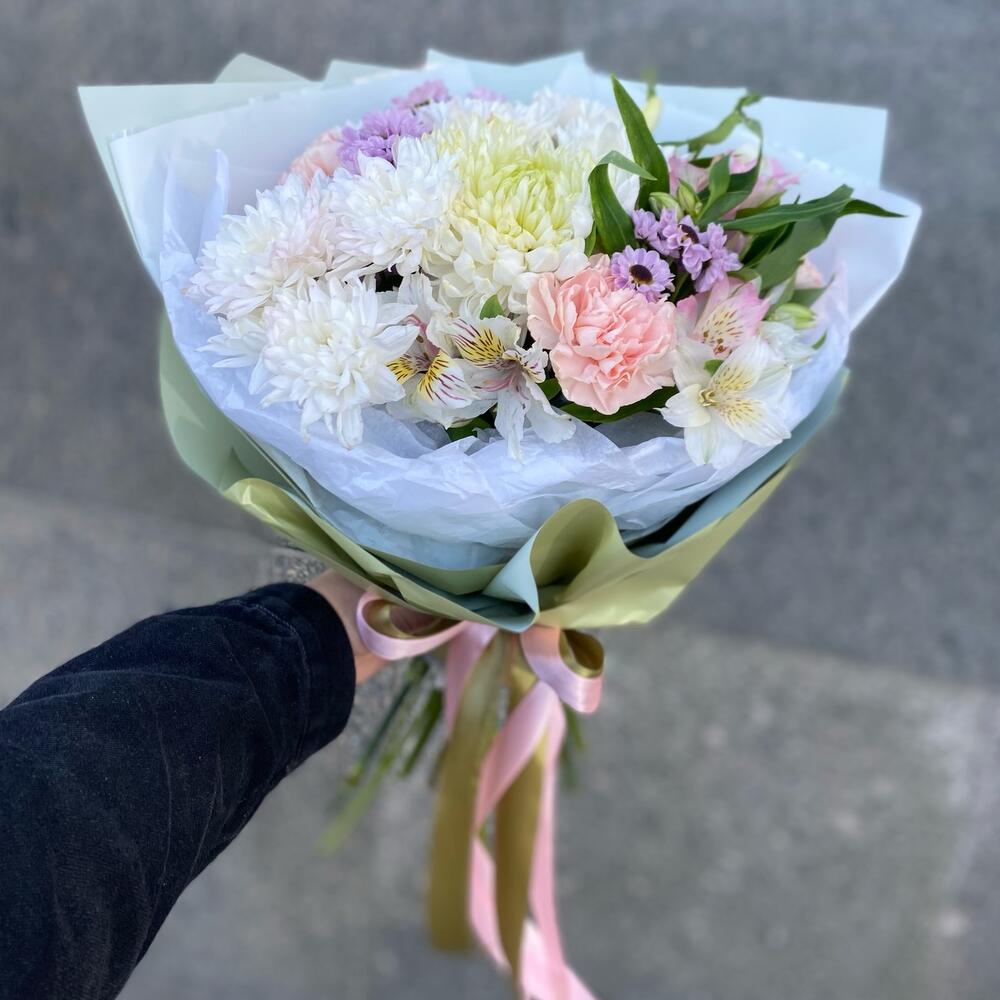 Альстромерия – 4 шт.Хризантема кустовая – 2 шт.Лента атласная – 5 шт.Диантус – 4 шт.Сантини – 3 шт.Упаковка дизайнерская – 7 шт.магнум белый – 1 шт.