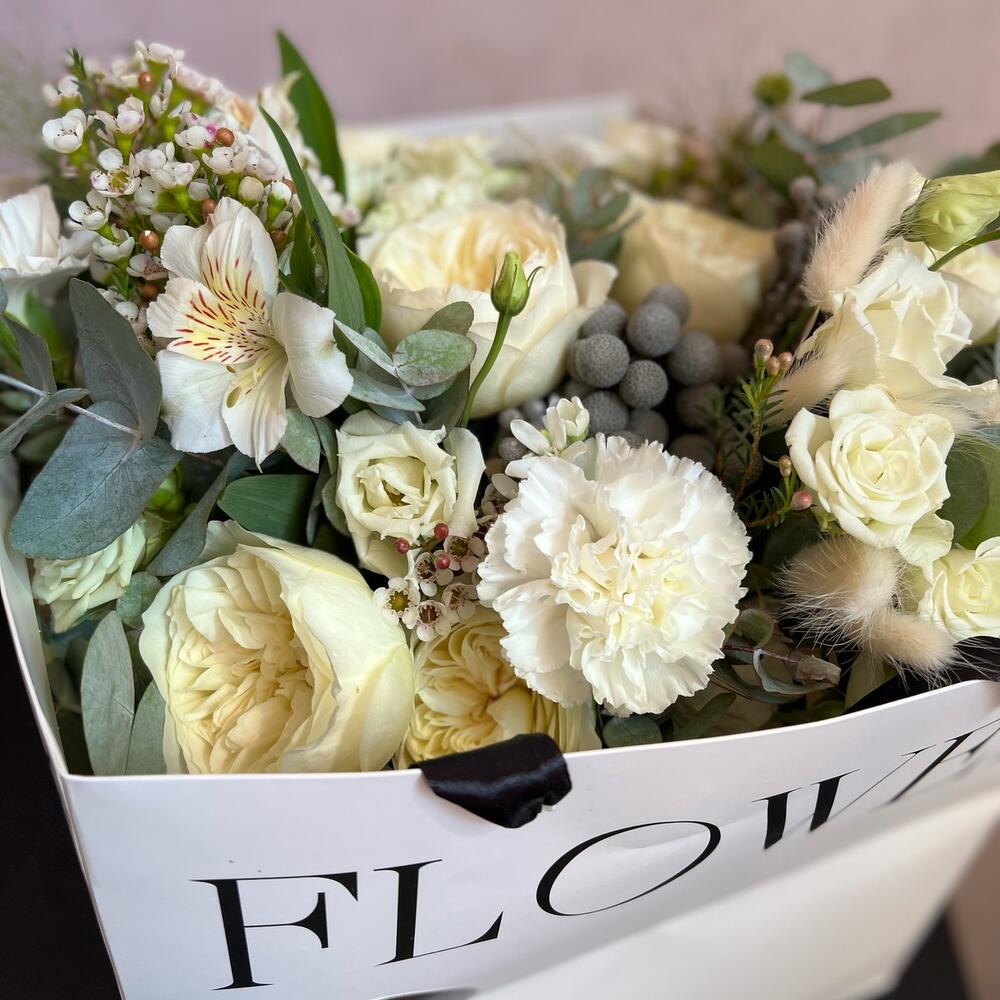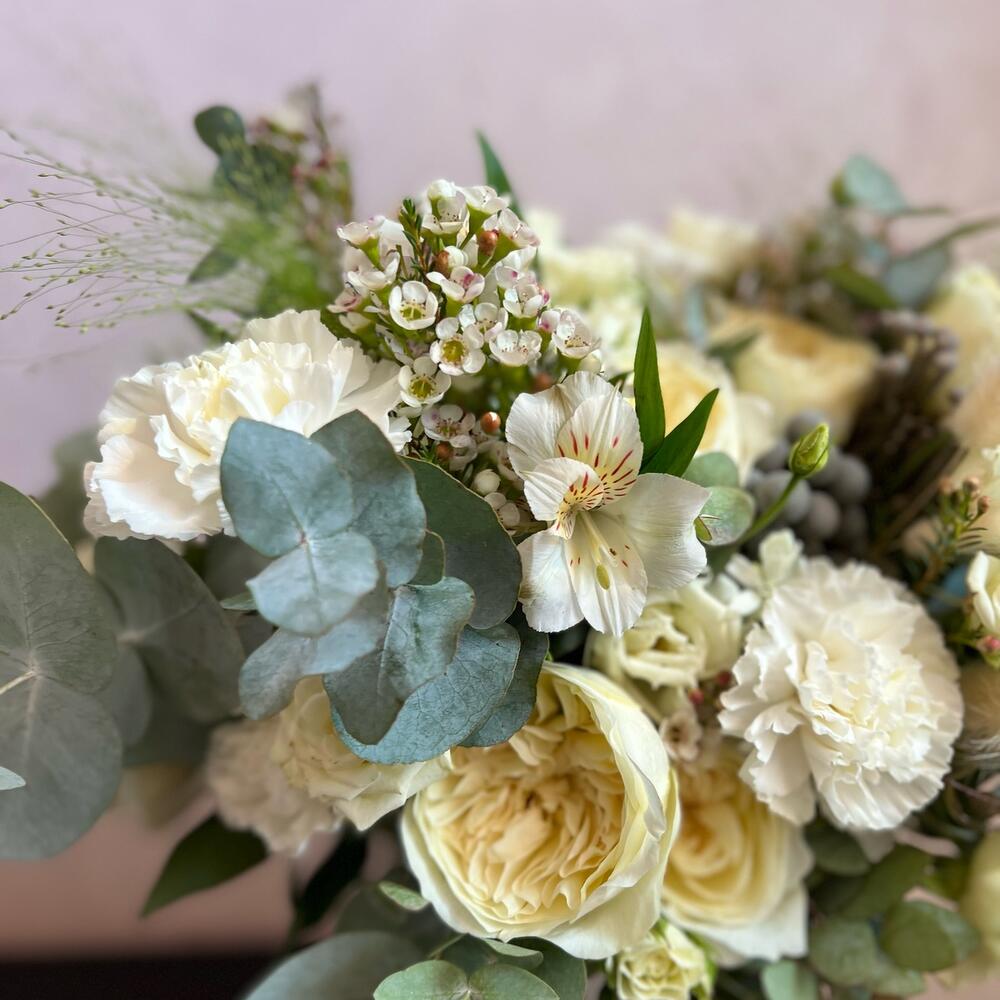 Кустовая роза – 5 шт.Пионовидная роза – 7 шт.Лизиантус (эустома) – 4 шт.Оксипеталум – 2 шт.Альстромерия – 3 шт.Диантус – 9 шт.Хамелациум – 3 шт.Бруния – 2 шт.Паникум – 3 шт.Эвкалипт – 5 шт.Атласная лента – 2 шт.