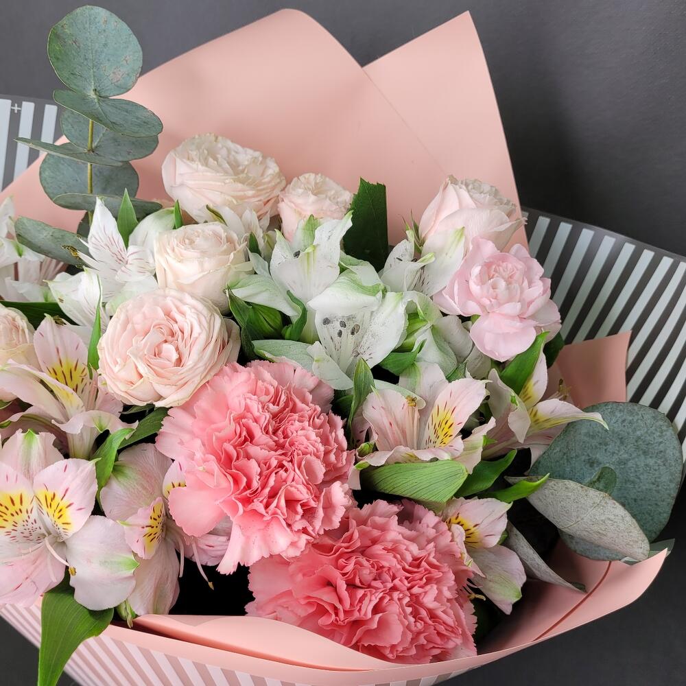 Роза кустовая – 2 шт.Альстромерия – 5 шт.Диантус – 3 шт.Эвкалипт – 1 шт.Упаковка дизайнерская – 1 шт.Лента атласная – 1 шт.