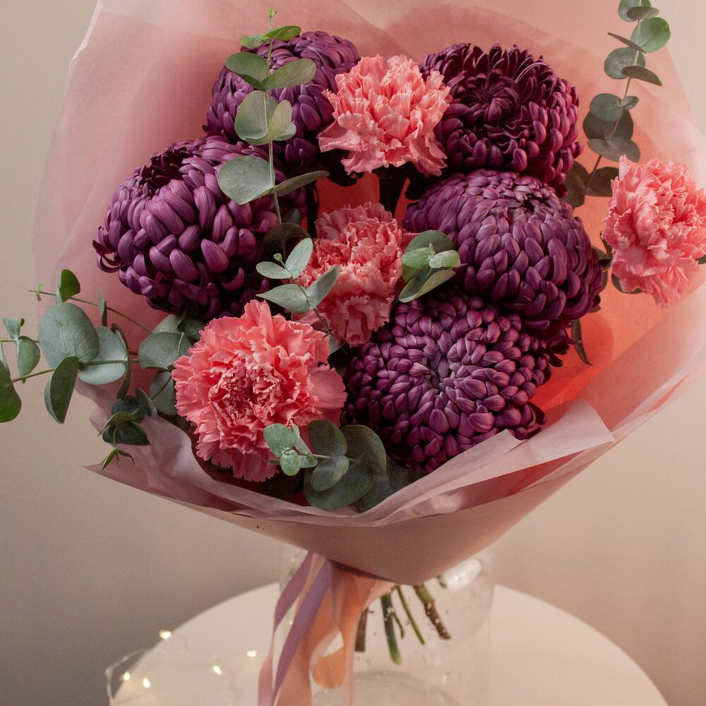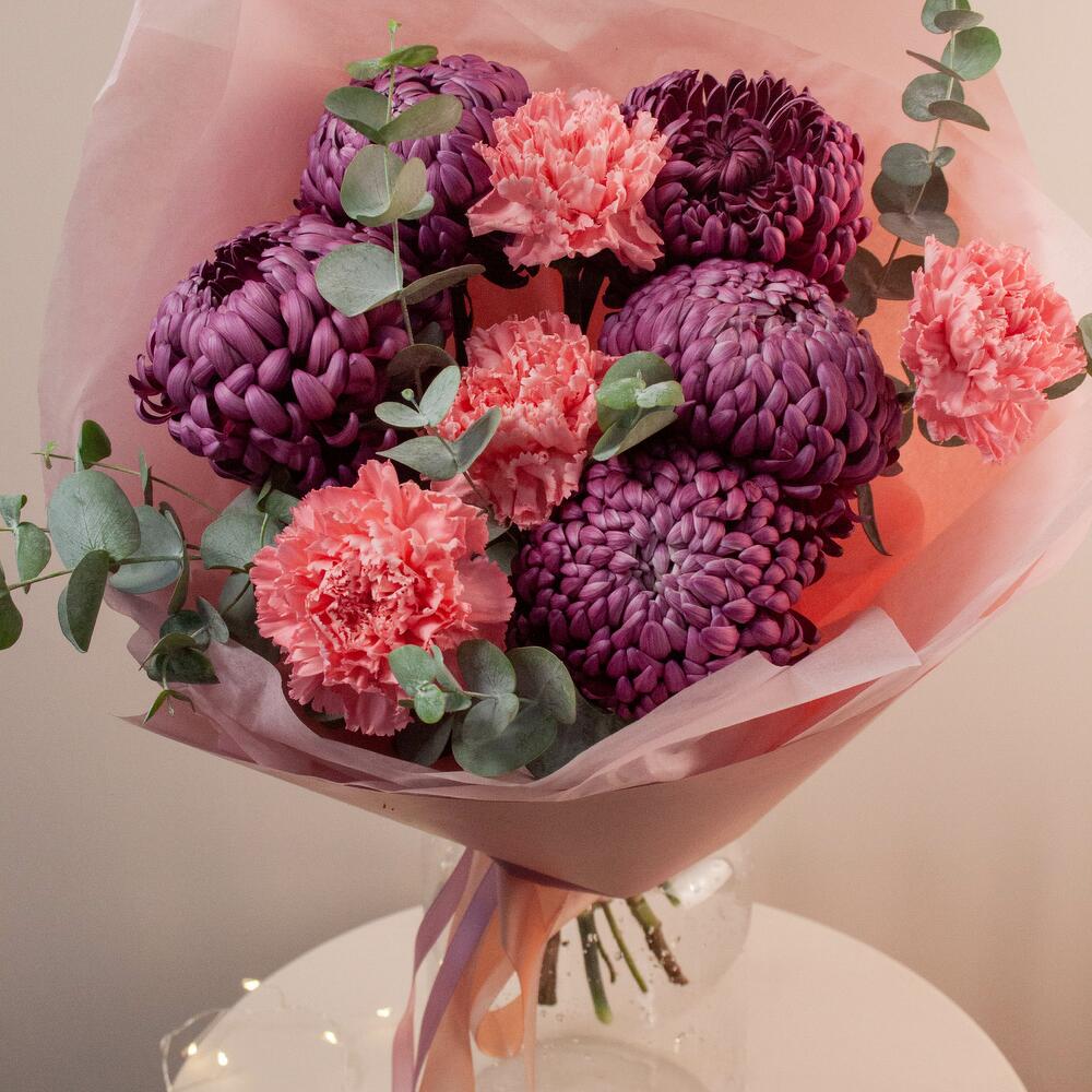 Гвоздики, Лизиантусы, Розы, Тюльпаны