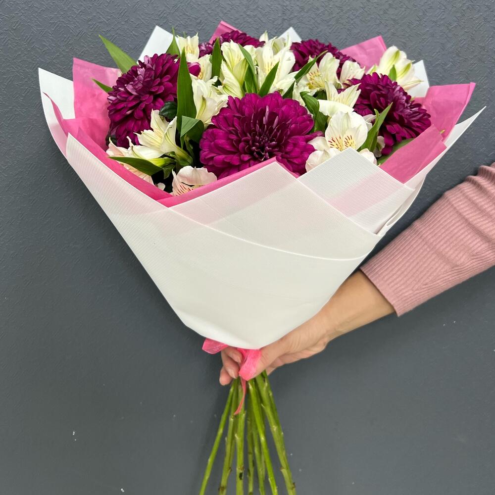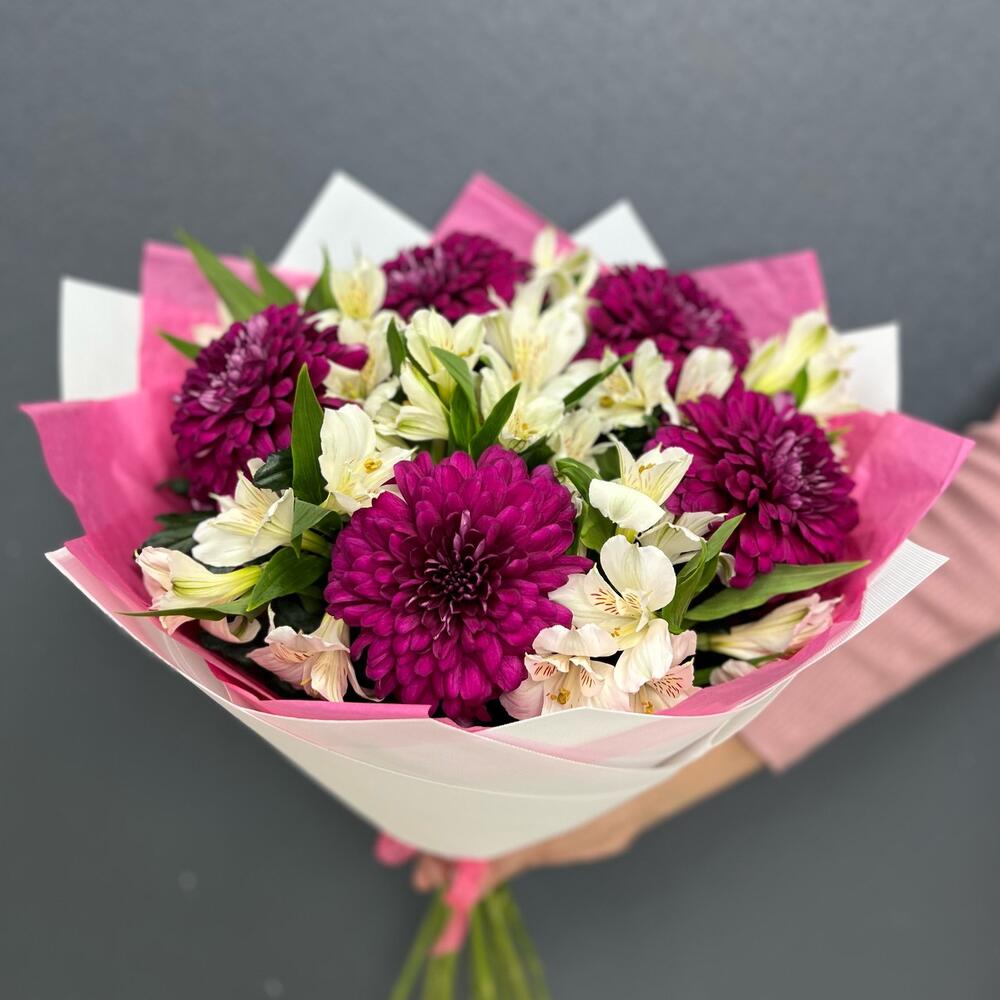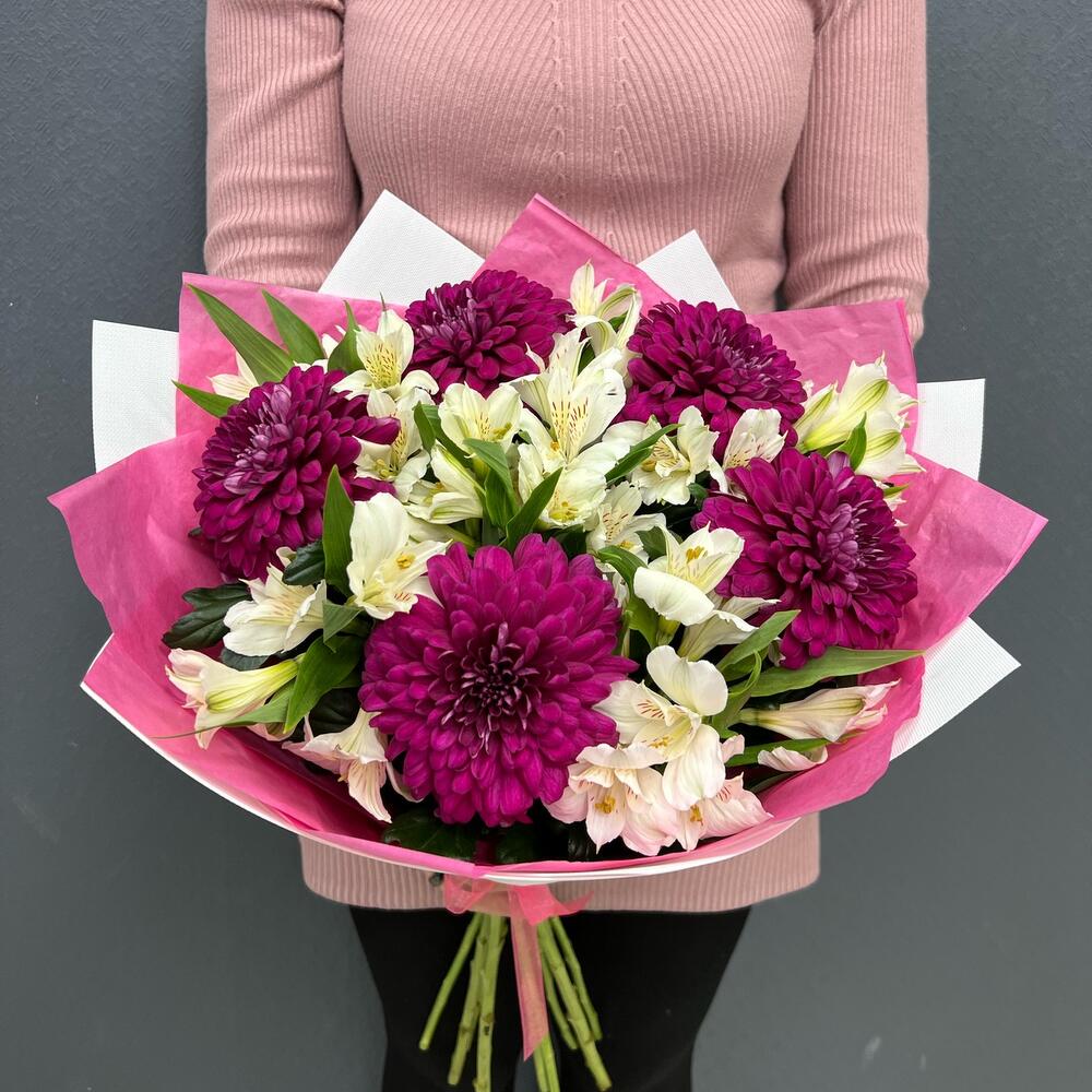 ламира хризантема – 5 шт.Альстромерия – 6 шт.Тишью – 2 шт.Пленка матовая – 2 шт.Лента атласная – 2 шт.