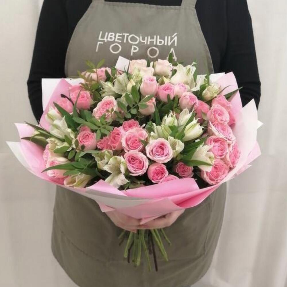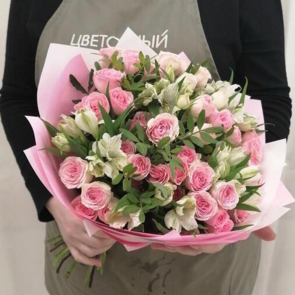 Альстромерии, Кустовые розы, Лизиантусы, Пионовидные розы, Розы, Ромашки