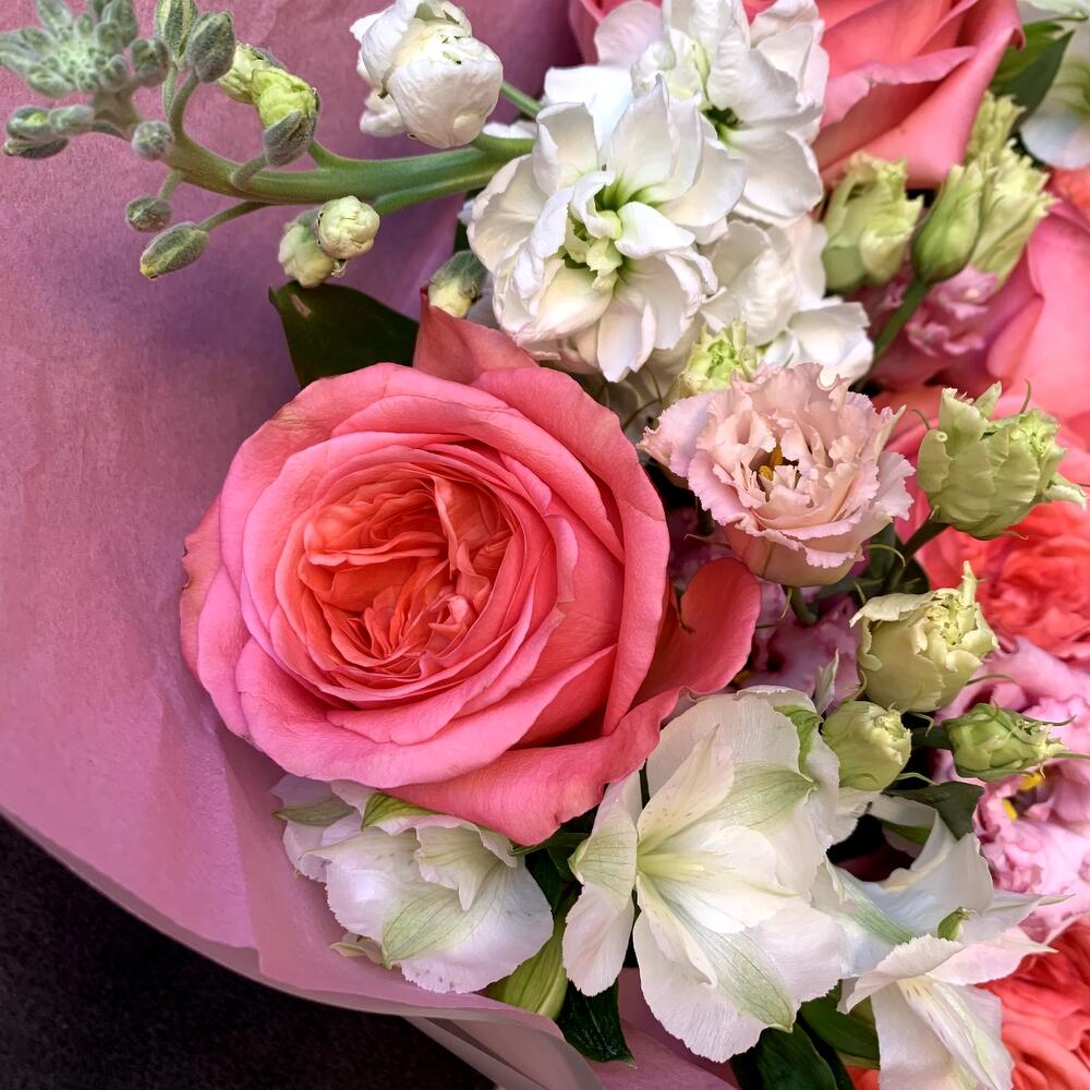 Альстромерия – 3 шт.Маттиола – 3 шт.Эвкалипт – 2 шт.Рускус сочи – 2 шт.Лизиантус розовый – 2 шт.Авторская упаковка – 1 шт.роза пинк экспрешн – 5 шт.