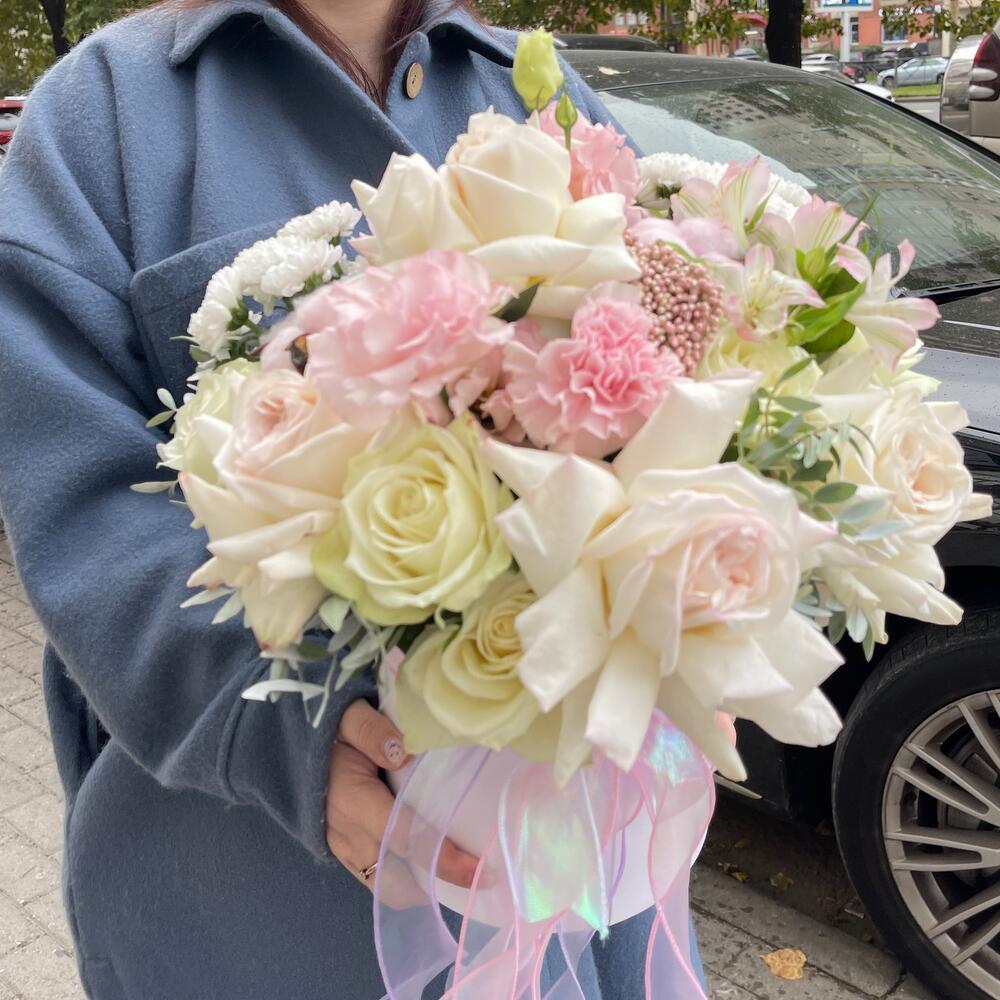 Нежная шикарная композиция порадует и удивит родных .Сочетание самых нежных роз произведёт самые приятные впечатления !Уважаемые покупатели! Пожалуйста обратите ваше внимание на размер композиции при заказе! Он учитывается вместе с упаковкой Чтобы наши прекрасные композиции дольше радовали получателя рекомендуем вам:⭐Не вынимать цветы из коробки/корзинки⭐Поливать композицию каждый день (воду нужно вливать в центр, чтобы вода правильно распределилась) ⭐Не ставить цветы у отопительных приборов и на сквозняке