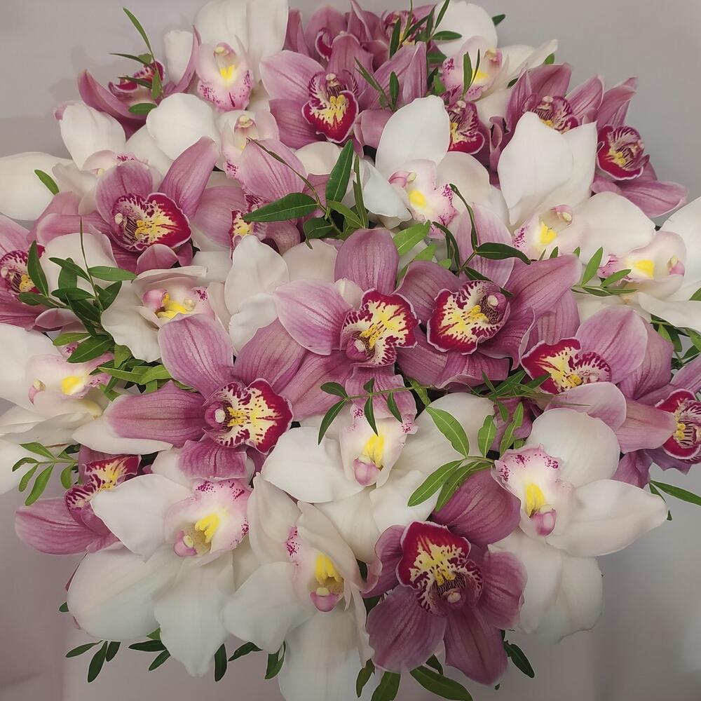 Орхидея Цимбидиум ветка – 2 шт.Коробка шляпная – 1 шт.Фисташка пучок – 1 шт.Оазис флористический – 2 шт.бант атласный – 1 шт.