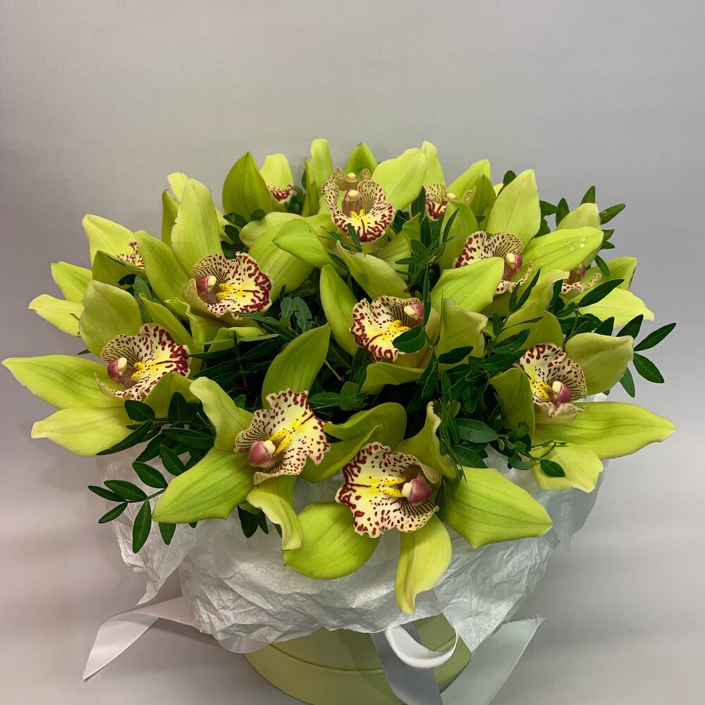 Орхидея Цимбидиум – 11 шт.Фисташка – 2 шт.Шляпная коробка – 1 шт.