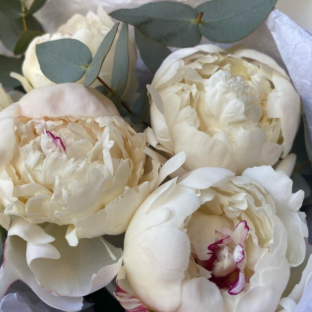 Белые пионы с эвкалиптом 5штук(сб032)