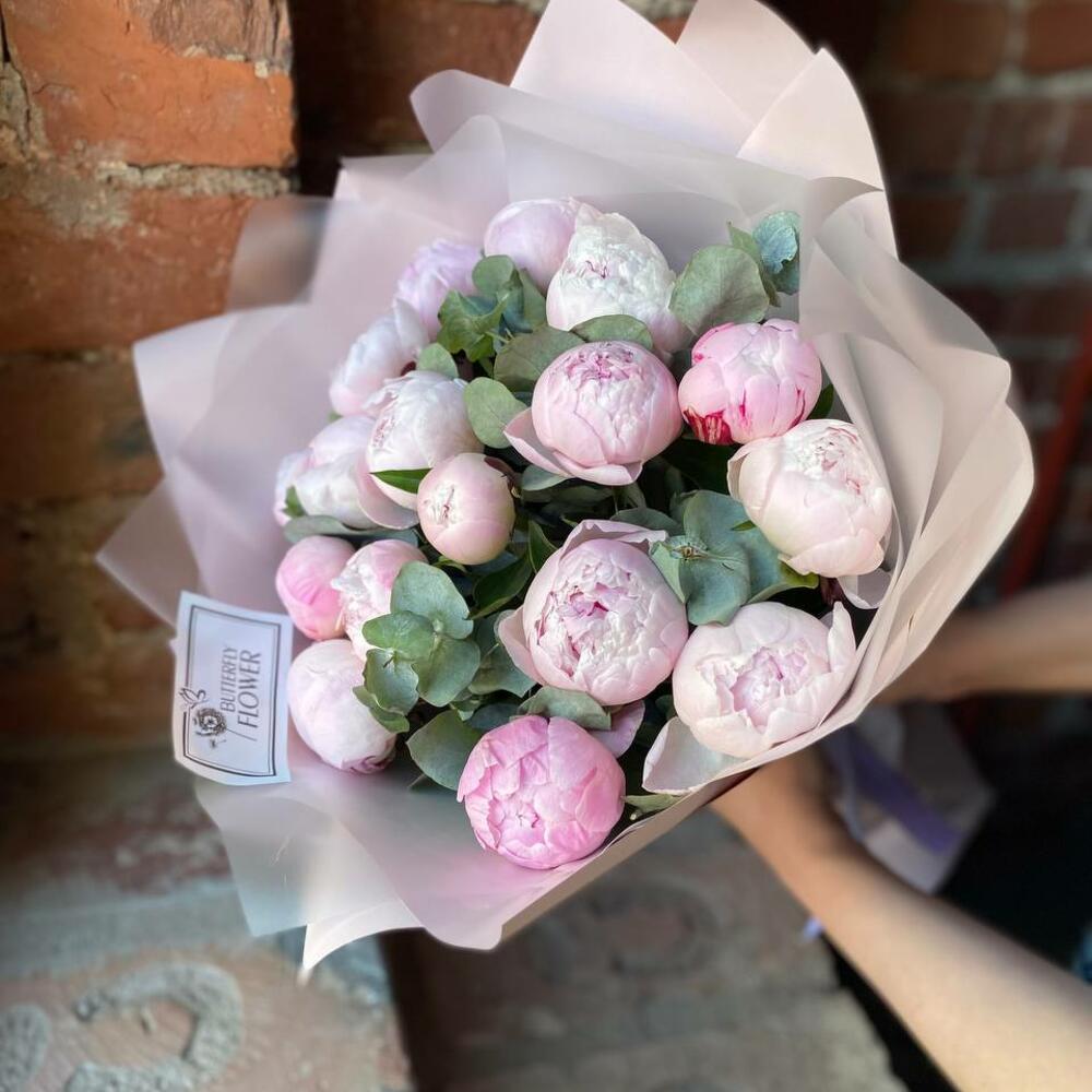 Букет из 17 розовых пионов и эвкалипта в дизайнерской упаковке “Анита Вулф”