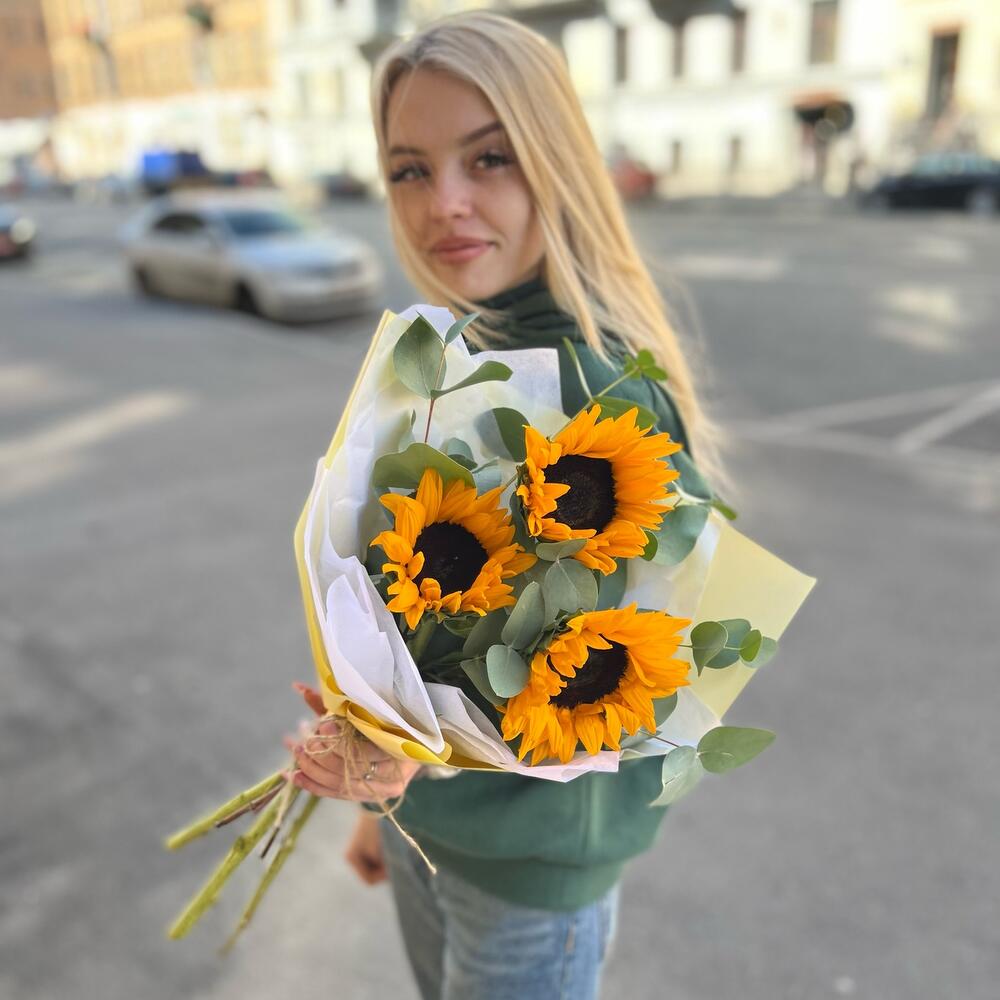 Эвкалипт – 3 шт.Тишью – 1 шт.Подсолнух – 3 шт.Пленка дизайнерская – 2 шт.бичевека натуральная – 1 шт.