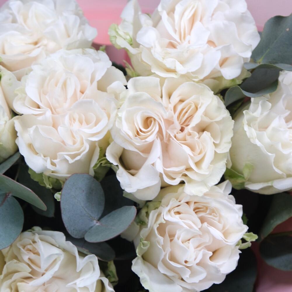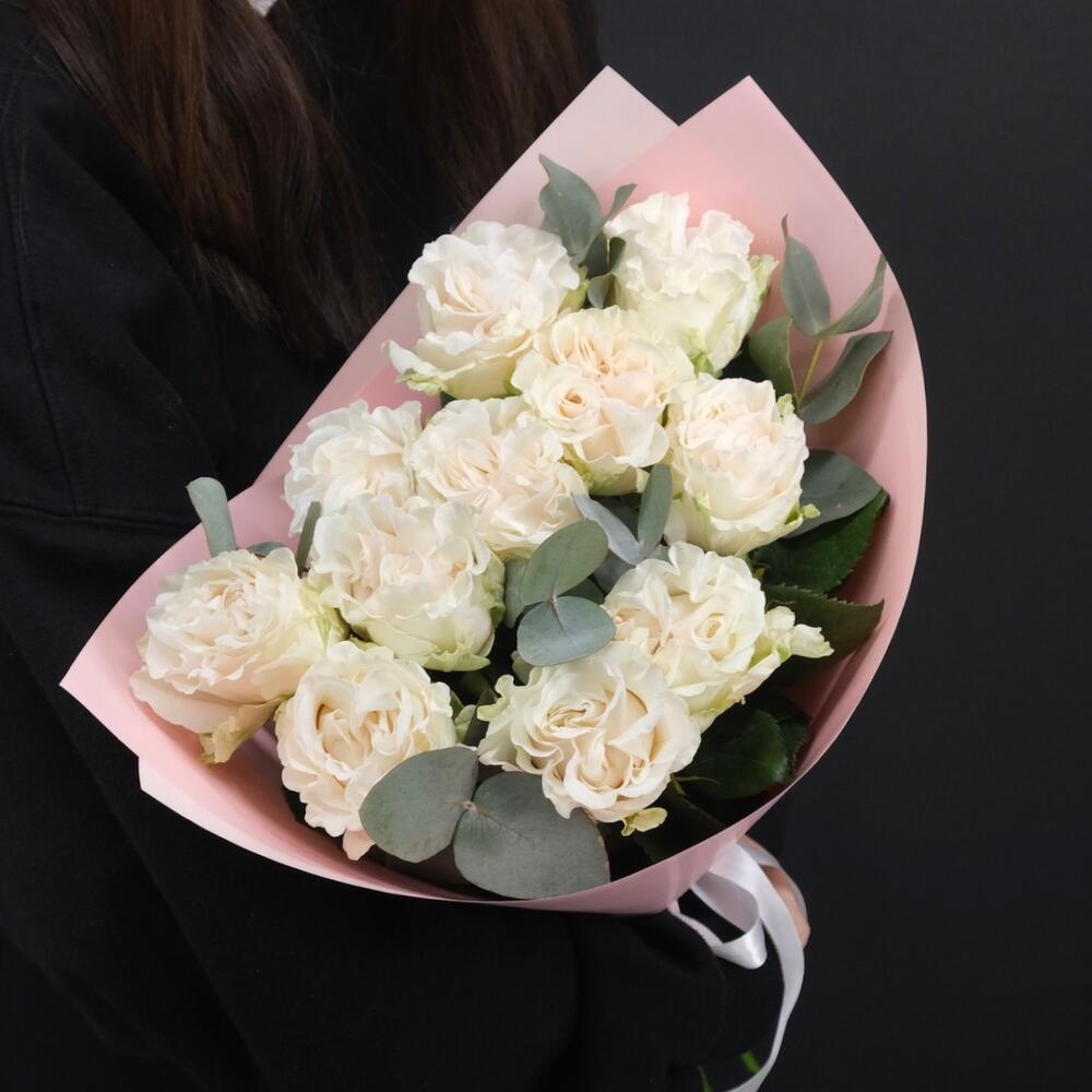 11 белых пионовидных роз с эвкалиптом
