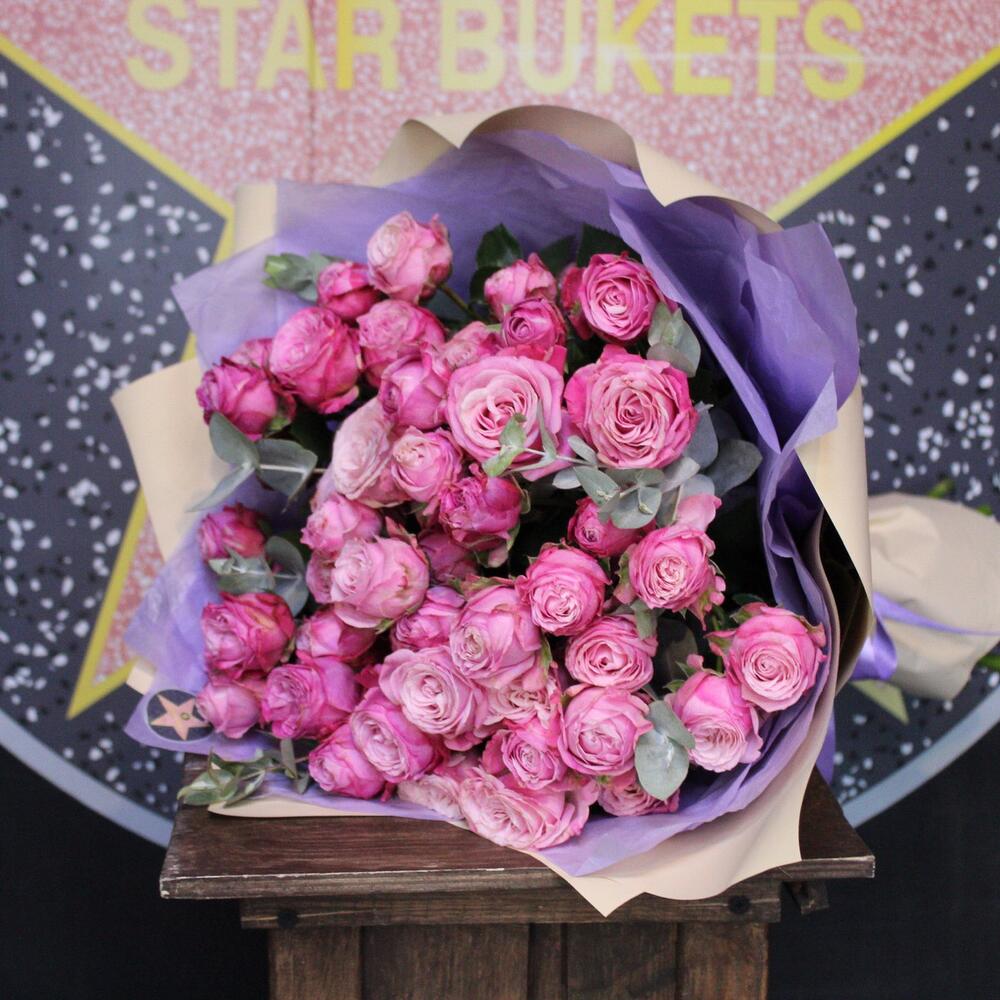 11 пионовидных кустовых роз + эвкалипт