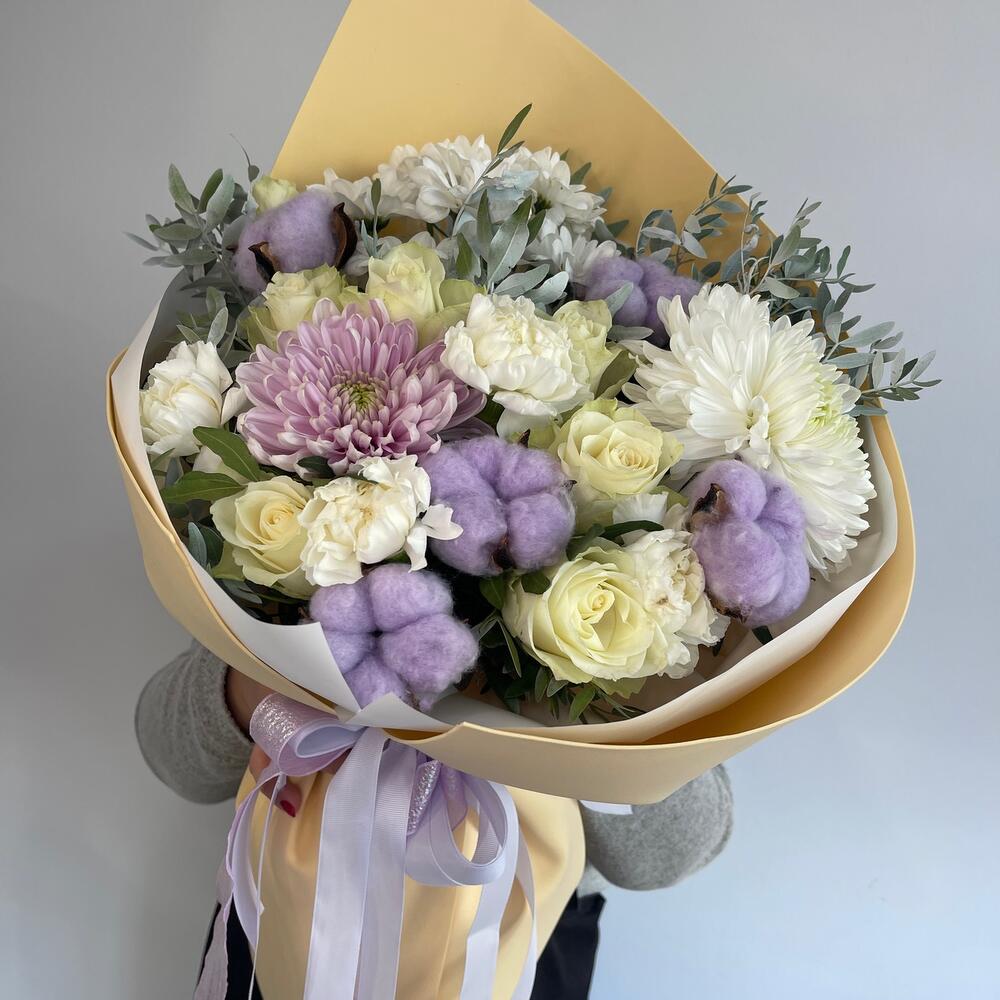 Хризантема кустовая – 1 шт.Кустовая роза – 2 шт.Роза Эквадор – 1 шт.Гвоздика – 2 шт.Лента атласная – 3 шт.Пленка матовая – 6 шт.Колосок – 1 шт.Хлопок натуральный – 5 шт.фисташка зелень – 5 шт.момоко хризантема – 1 шт.