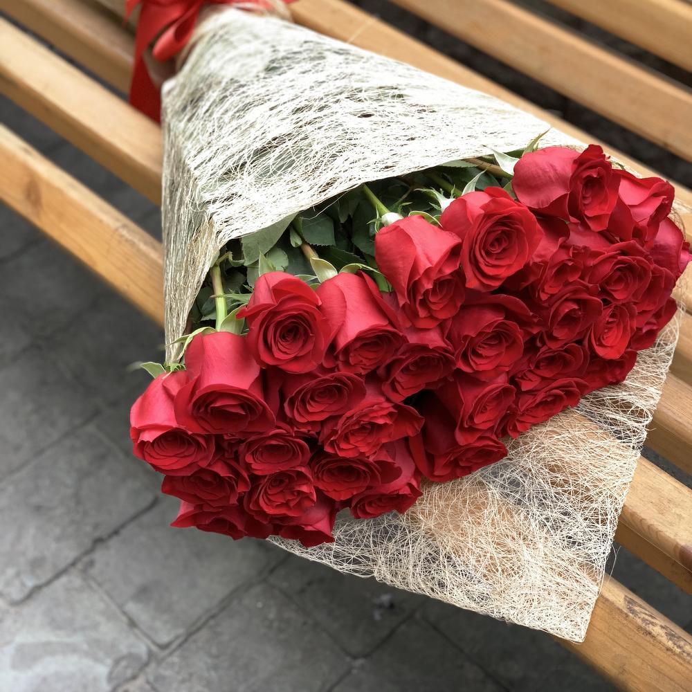 Букет высоких метровых роз стильно оформленный в элитную упаковку сизаль.