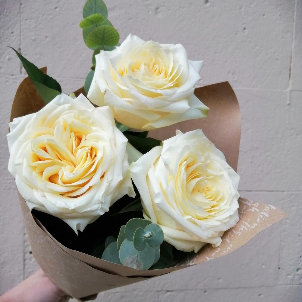 роза кендллайт – 3 шт.Эвкалипт – 1 шт.Упаковка крафт – 1 шт.Лента – 1 шт.