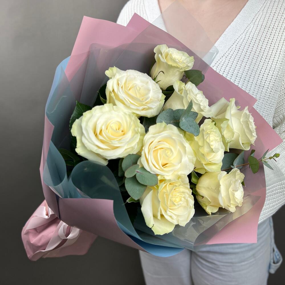 Эвкалипт – 3 шт.Лента атласная – 2 шт.Пленка матовая – 5 шт.Роза мондиаль 50 см – 9 шт.пленка полупрозрачная – 4 шт.