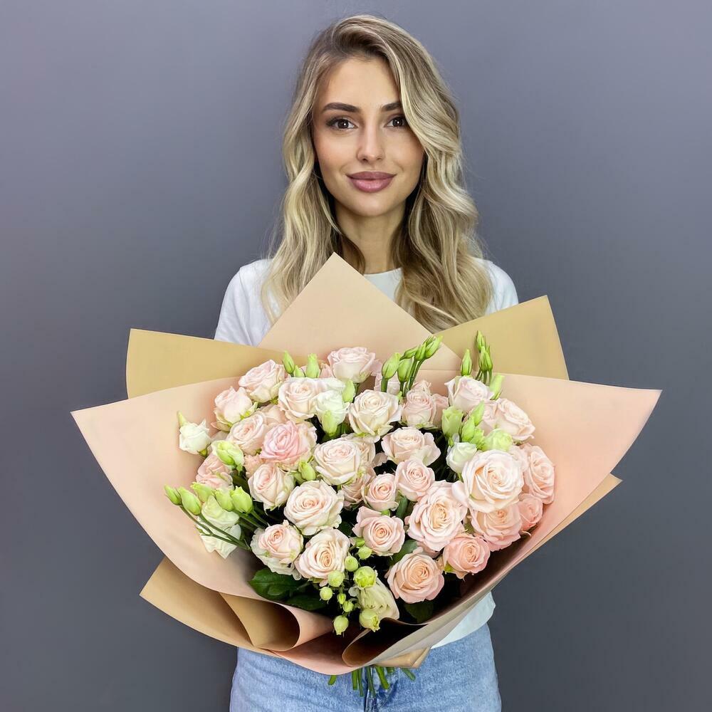 Букет пионовидных роз нежного, кремового оттенка бережно упакованные в крафт упаковку. Пионовидные розы считаются символом романтики и верности. Их полные бутоны отображают множество ярких чувств и любви. Благодаря своей редкой расцветке, превосходным эстетическим данным и аромату их относят к самым красивым сортам.