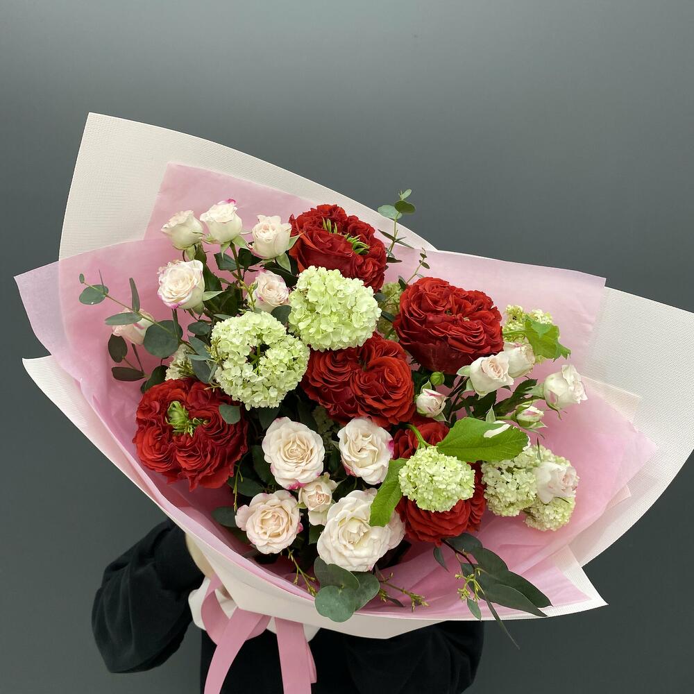 Альстромерии, Кустовые розы, Лизиантусы, Пионовидные розы, Розы, Ромашки