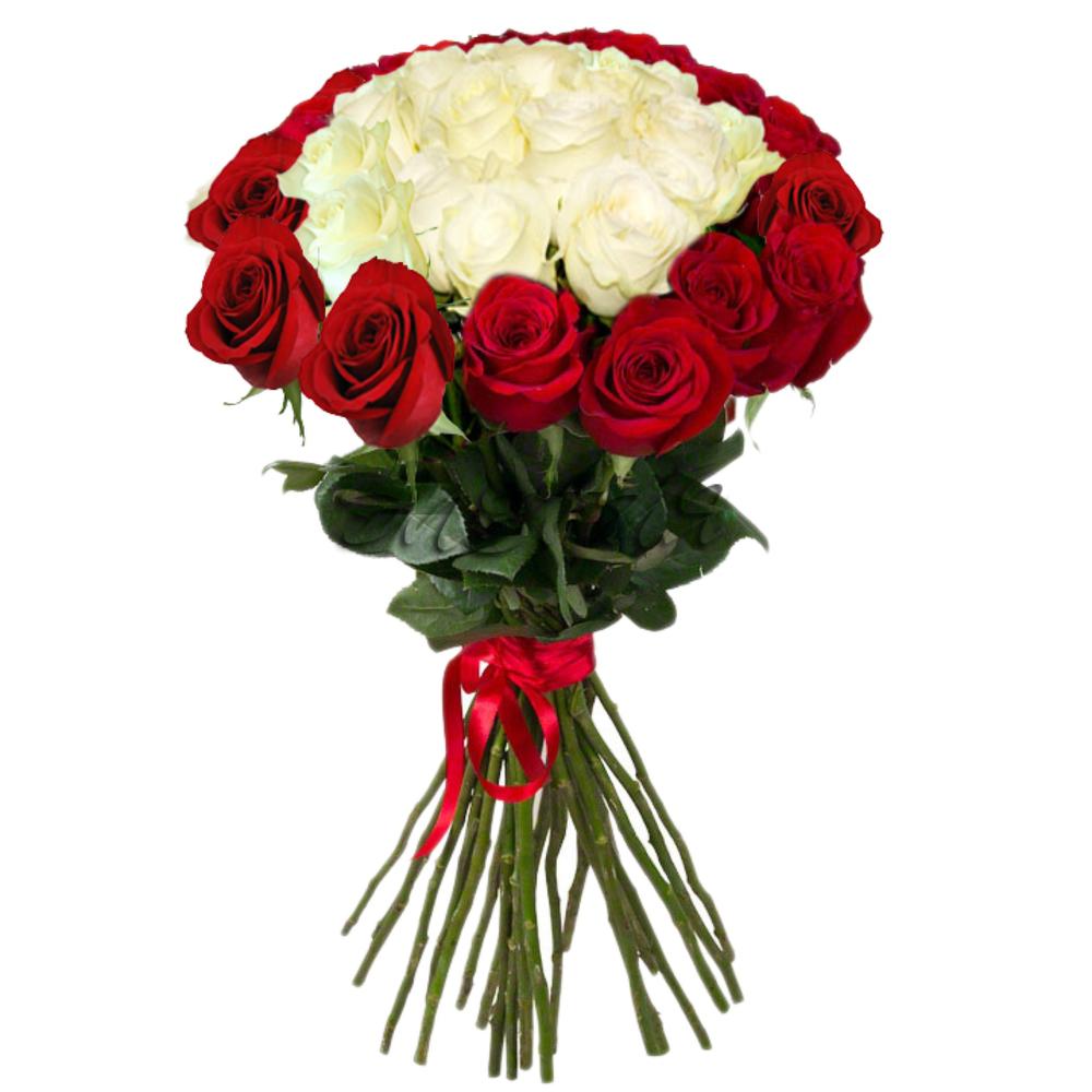 Атласная лента – 1 шт.Красная роза 70 см – 16 шт.белая роза 70 см – 15 шт.