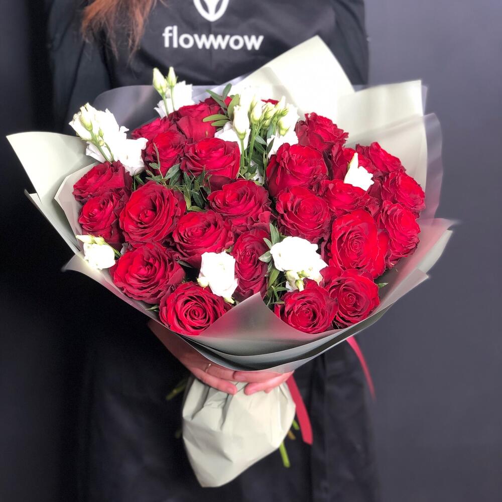 Роза – 25 шт.Эустома – 4 шт.Фисташка пучок – 5 шт.Крафт упаковка – 5 шт.