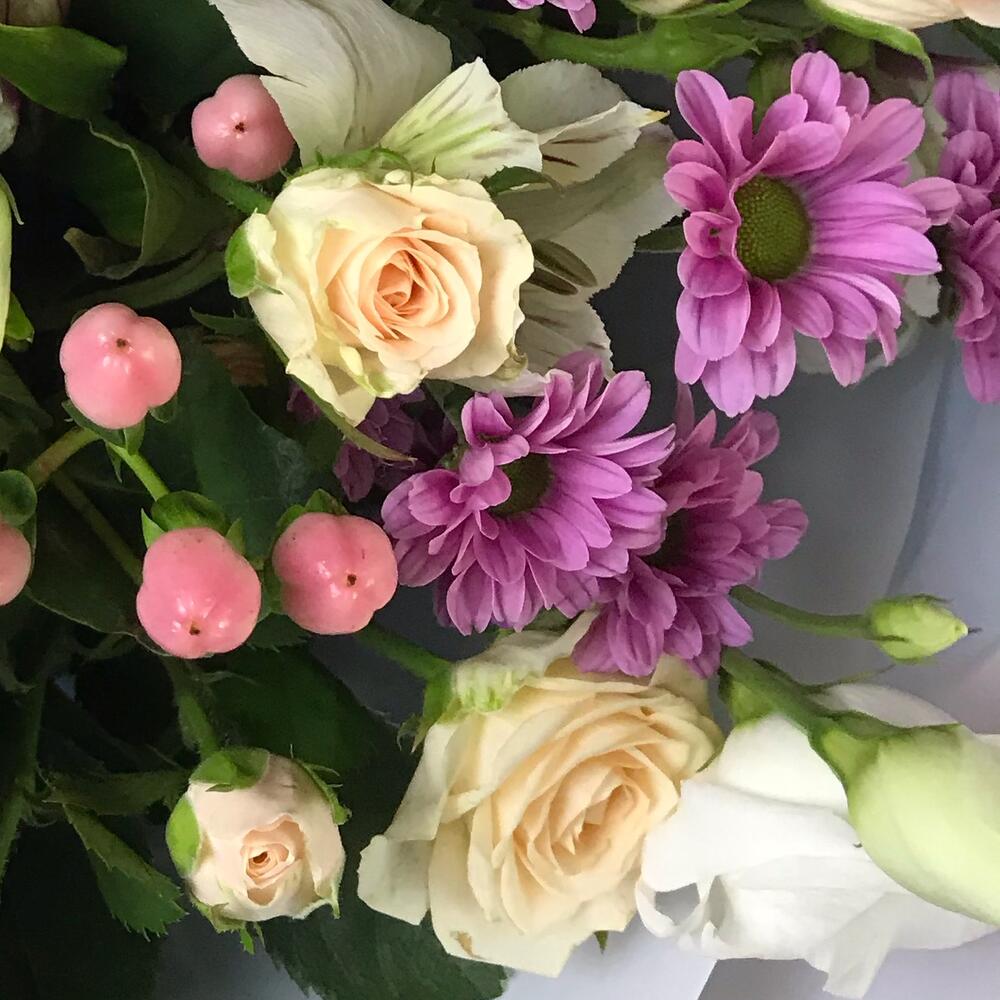 Лизиантус – 3 шт.Лимониум – 2 шт.Роза кустовая – 3 шт.Хризантема кустовая – 4 шт.Роза – 3 шт.Хиперикум – 3 шт.Упаковка дизайнерская – 2 шт.