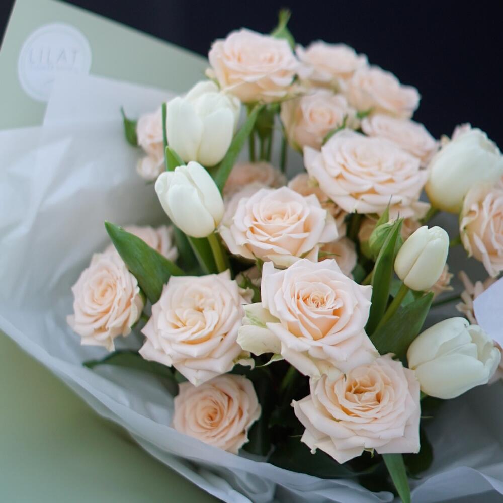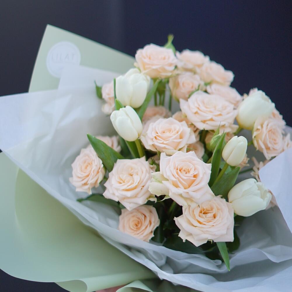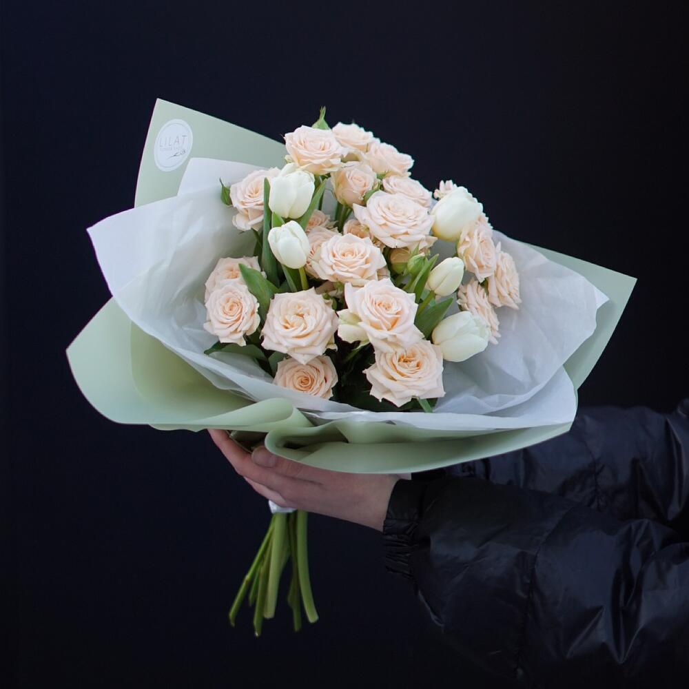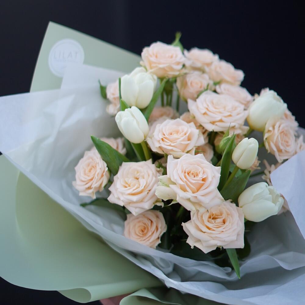 Гвоздики, Лизиантусы, Розы, Тюльпаны