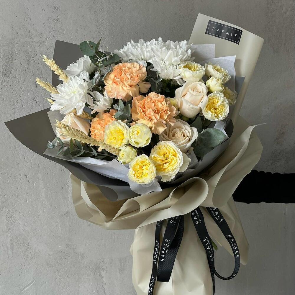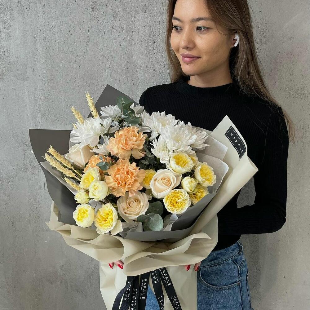 Альстромерии, Кустовые розы, Лизиантусы, Пионовидные розы, Розы, Ромашки