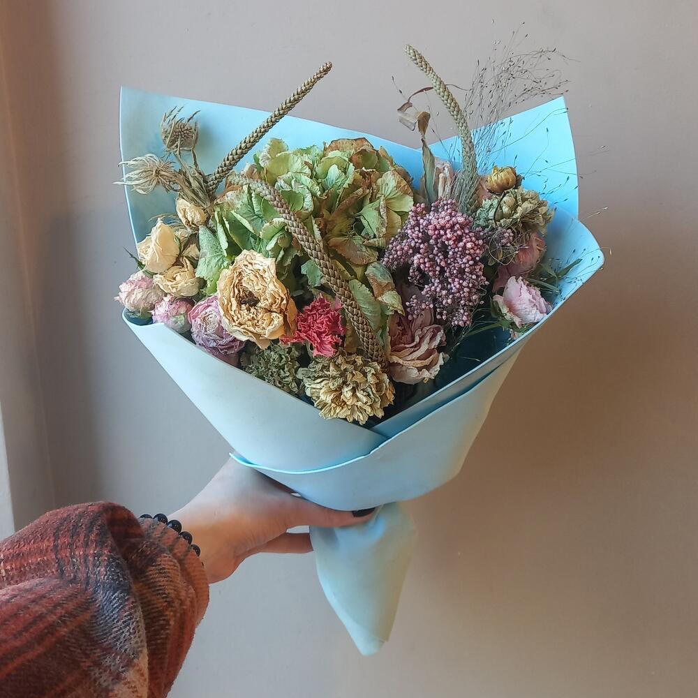 Гортензия – 1 шт.Эрингиум зеленый – 1 шт.Роза кустовая – 2 шт.Роза – 3 шт.Оксипеталум – 1 шт.Гвоздика – 3 шт.
