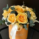 Пиафлор (оазис) – 1 шт.Эвкалипт – 2 шт.Роза – 15 шт.Лента атласная – 2 шт.Коробка шляпная – 1 шт.Упаковка дизайнерская – 2 шт.