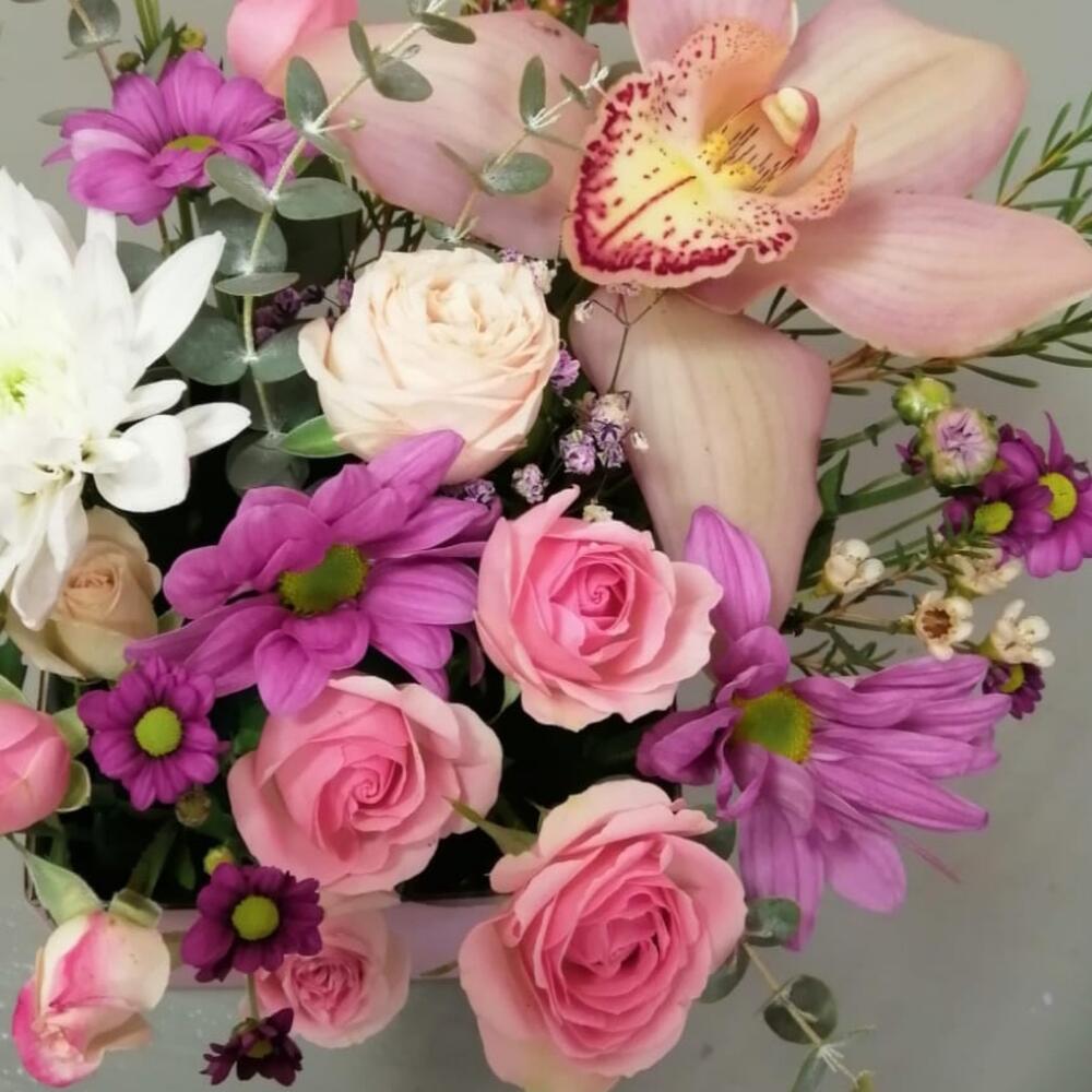 орхидея колокольчик – 1 шт.Роза кустовая – 1 шт.Хризантема кустовая – 1 шт.Ваксфлауэр – 1 шт.Оазис флористический – 1 шт.Коробка прямоугольная – 1 шт.Эвкалипт – 1 шт.