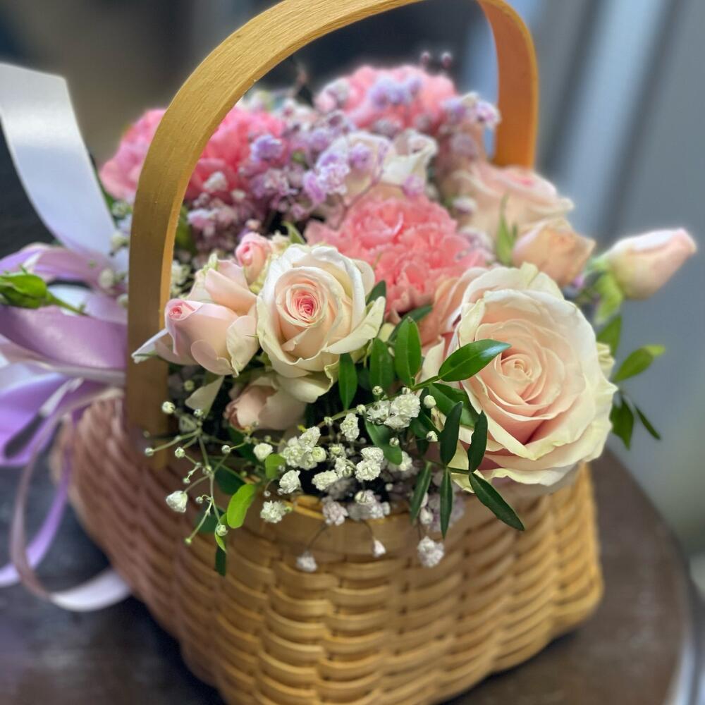 Роза – 1 шт. Диантус – 3 шт. Роза кустовая – 2 шт. Гипсофила – 1 шт. зелень декоративная – 1 шт. Корзина плетеная – 1 шт.