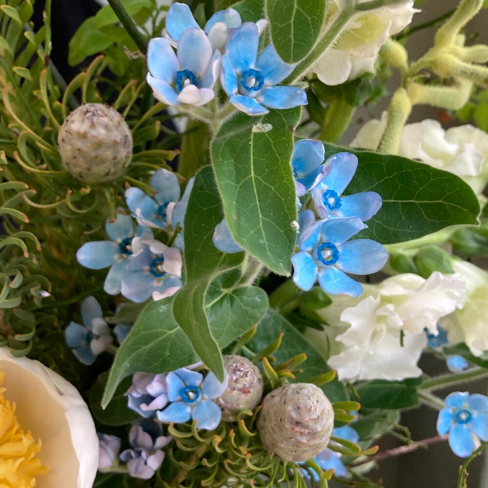 Дельфиниум – 2 шт.Маттиола – 2 шт.Пион – 2 шт.Лента атласная – 1 шт.Оксипеталум – 2 шт.Анигозантус – 1 шт.Львиный зев – 2 шт.Каапс – 2 шт.тубироза – 1 шт.ирландский колокольчик – 1 шт.тимофеевка пучок – 1 шт.
