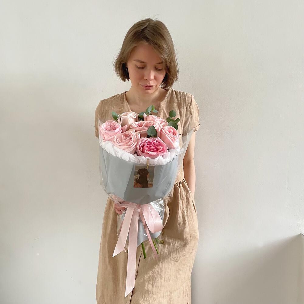 Эвкалипт – 3 шт.Упаковка дизайнерская – 1 шт.роза пинк охара(ароматная) – 7 шт.