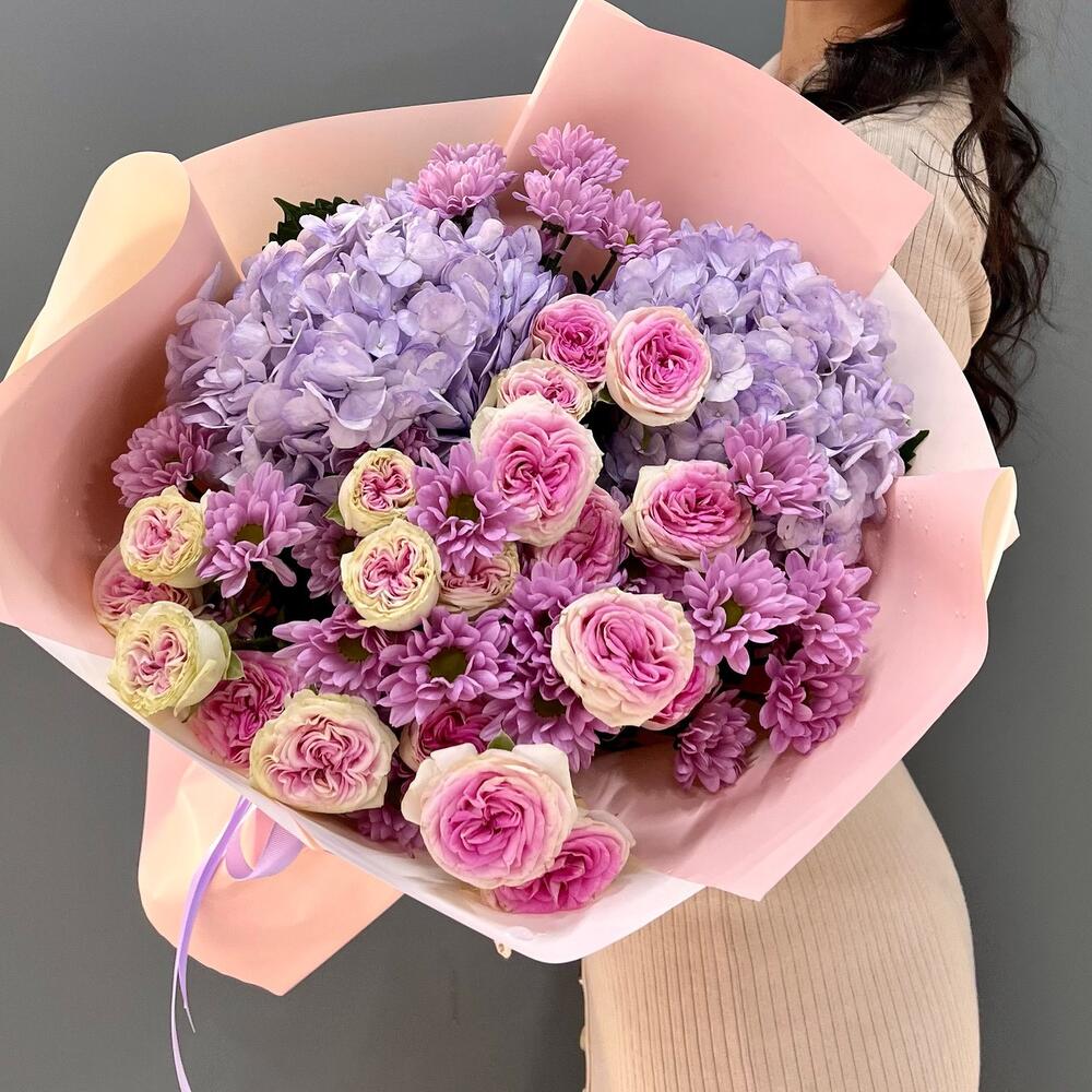 Альстромерии, Гортензии, Кустовые розы, Лизиантусы, Розы, Хризантемы
