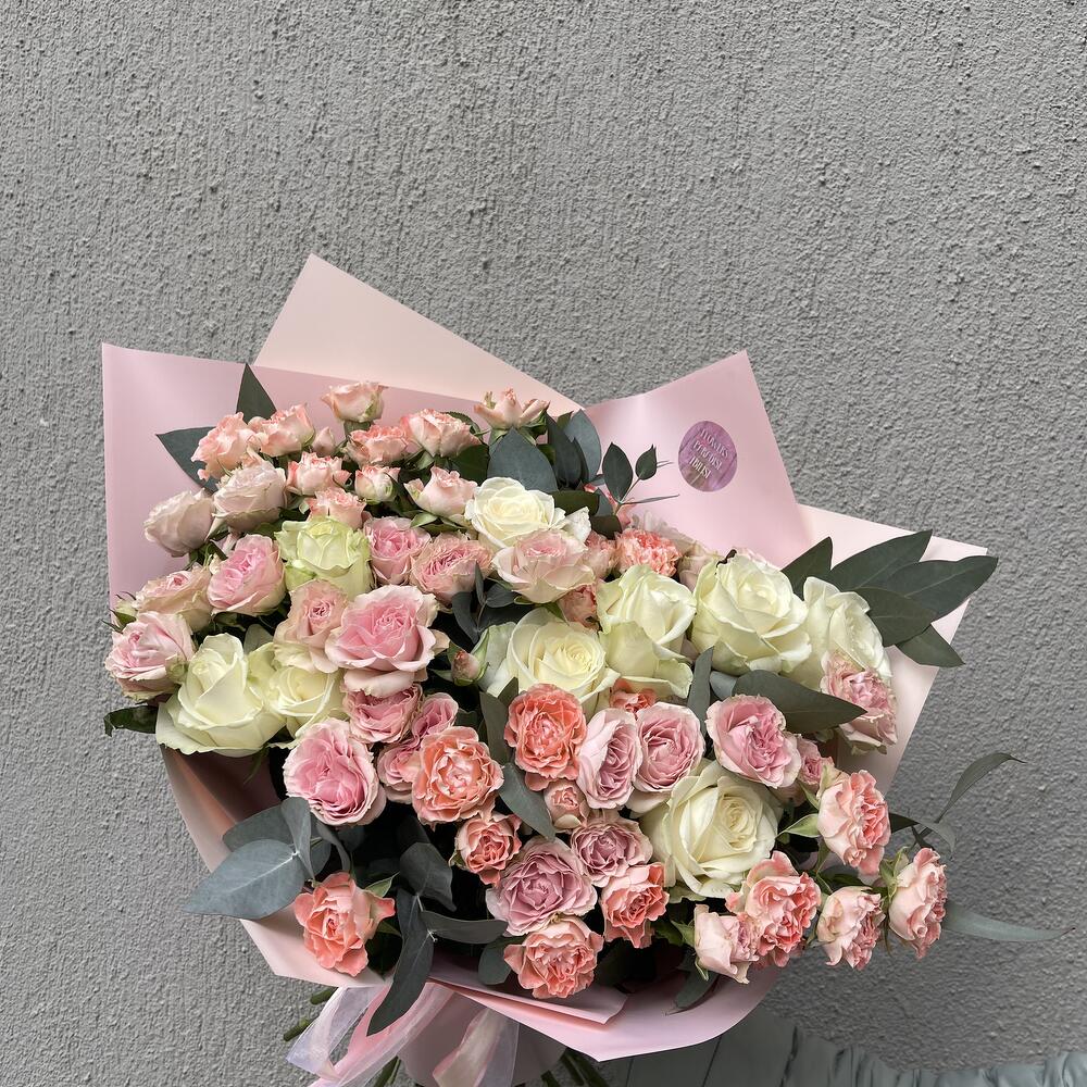 Роза одноголовая – 9 шт. Роза кустовая – 10 шт. Эвкалипт – 4 шт. Упаковка – 1 шт. Атласная лента – 1 шт.