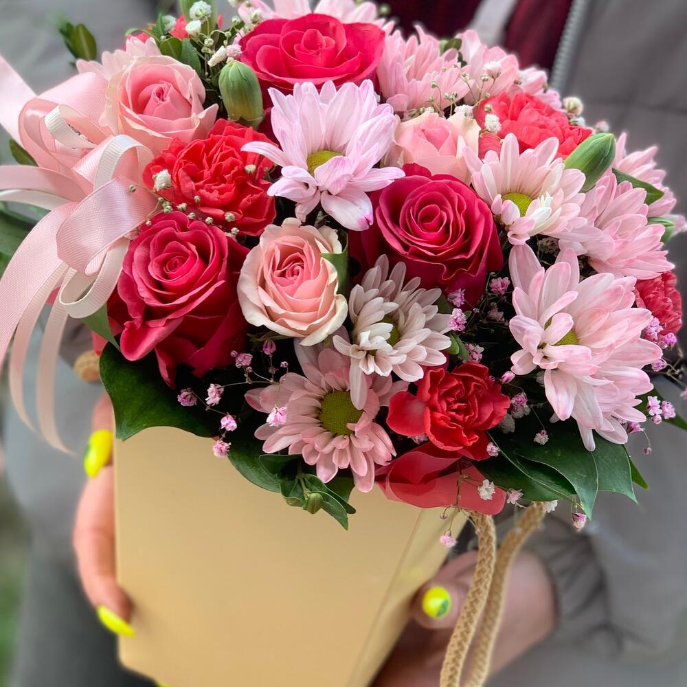 Гипсофила – 1 шт.Роза кустовая – 2 шт.Хризантема кустовая – 3 шт.Роза – 3 шт.Коробка – 1 шт.зелень декоративная – 5 шт.