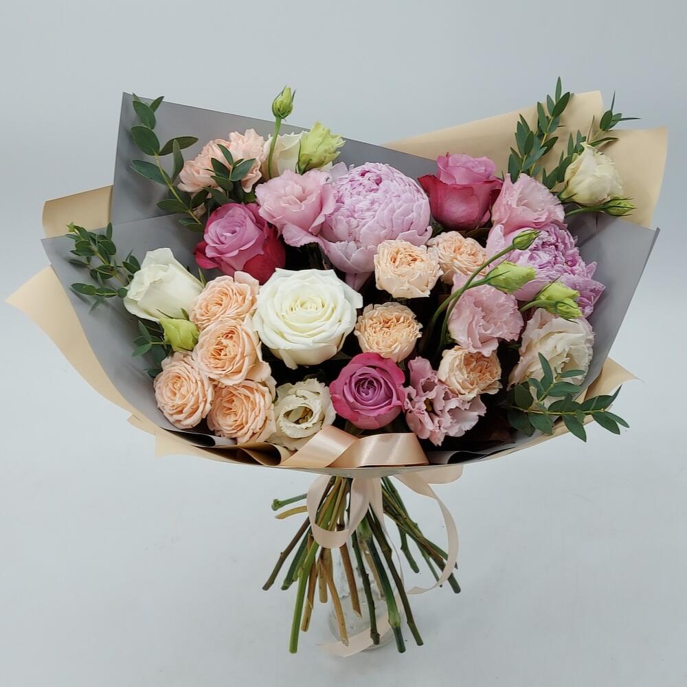 Пион – 2 шт.Роза кустовая – 3 шт.Эвкалипт – 3 шт.Роза Эквадор – 6 шт.Эустома – 3 шт.Упаковка дизайнерская – 1 шт.зелень стаффажная – 6 шт.гвоздика сортовая (диантус) – 1 шт.