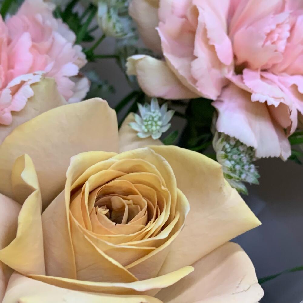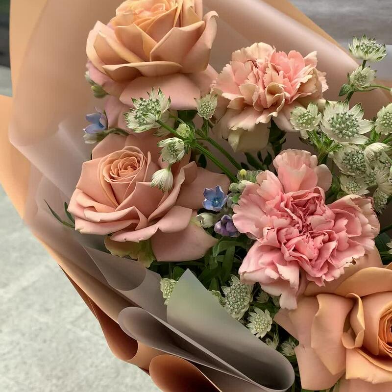 Роза Капучино – 3 шт.Диантус карамельный – 4 шт.Озотамнус – 2 шт.Оксипеталум – 2 шт.Упаковка дизайнерская – 1 шт.