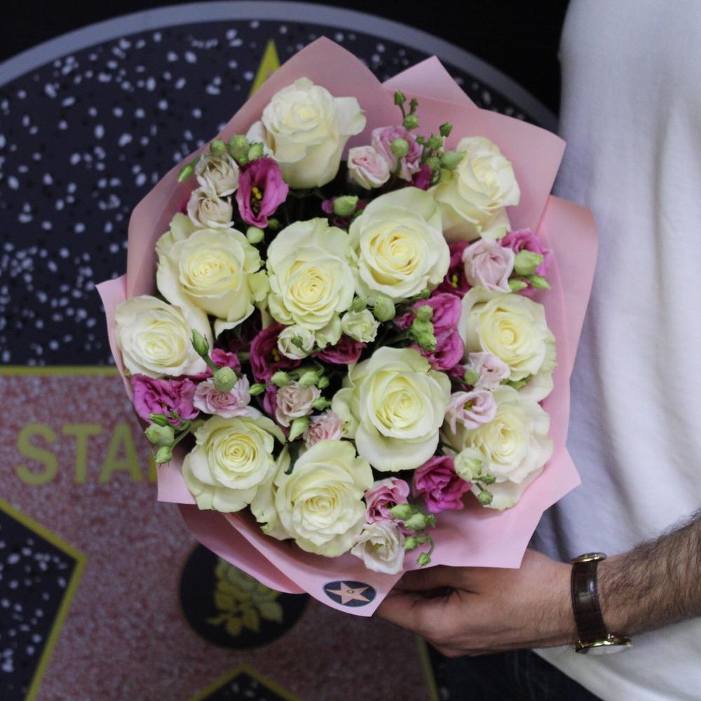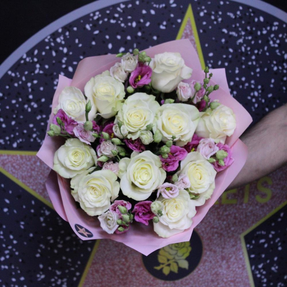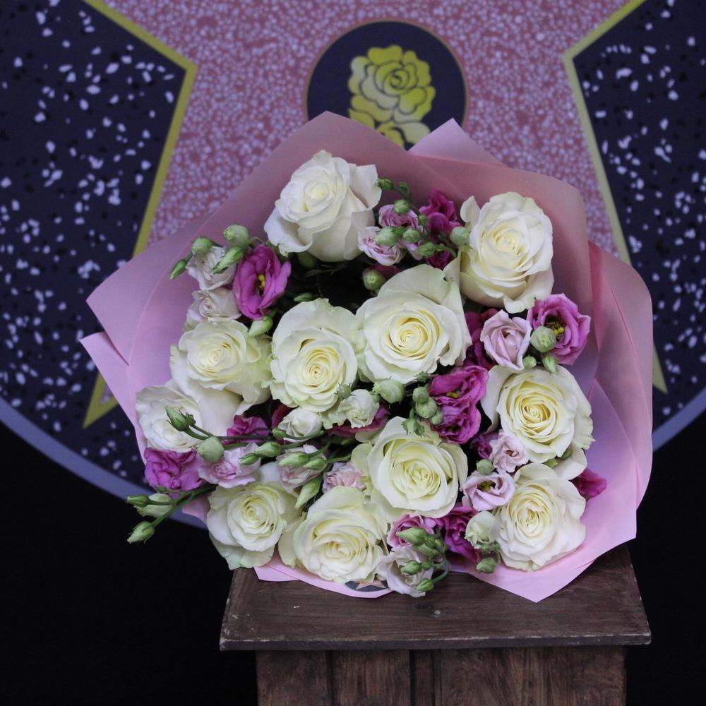 Роза премиум – 11 шт.Эустома – 7 шт.Пленка дизайнерская – 3 шт.Лента атласная – 2 шт.