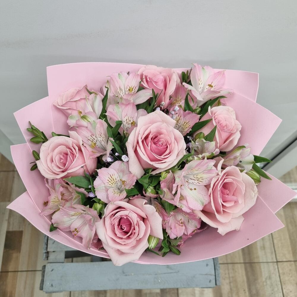 Нежный моногамный букет из роз с добавлением альстромерии