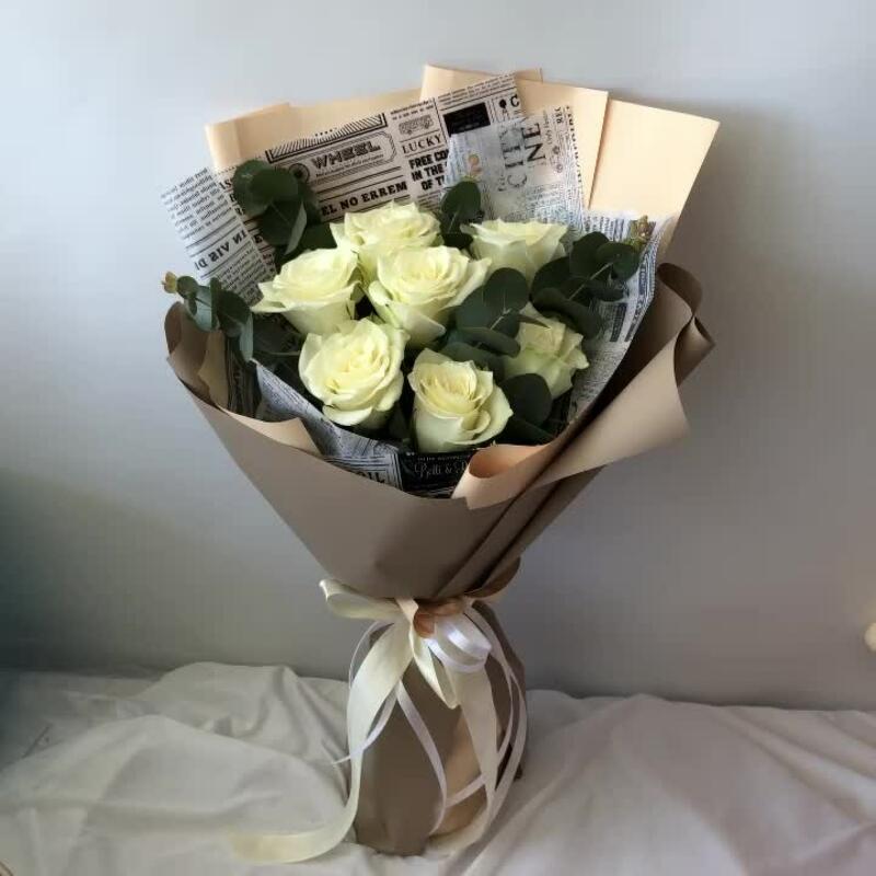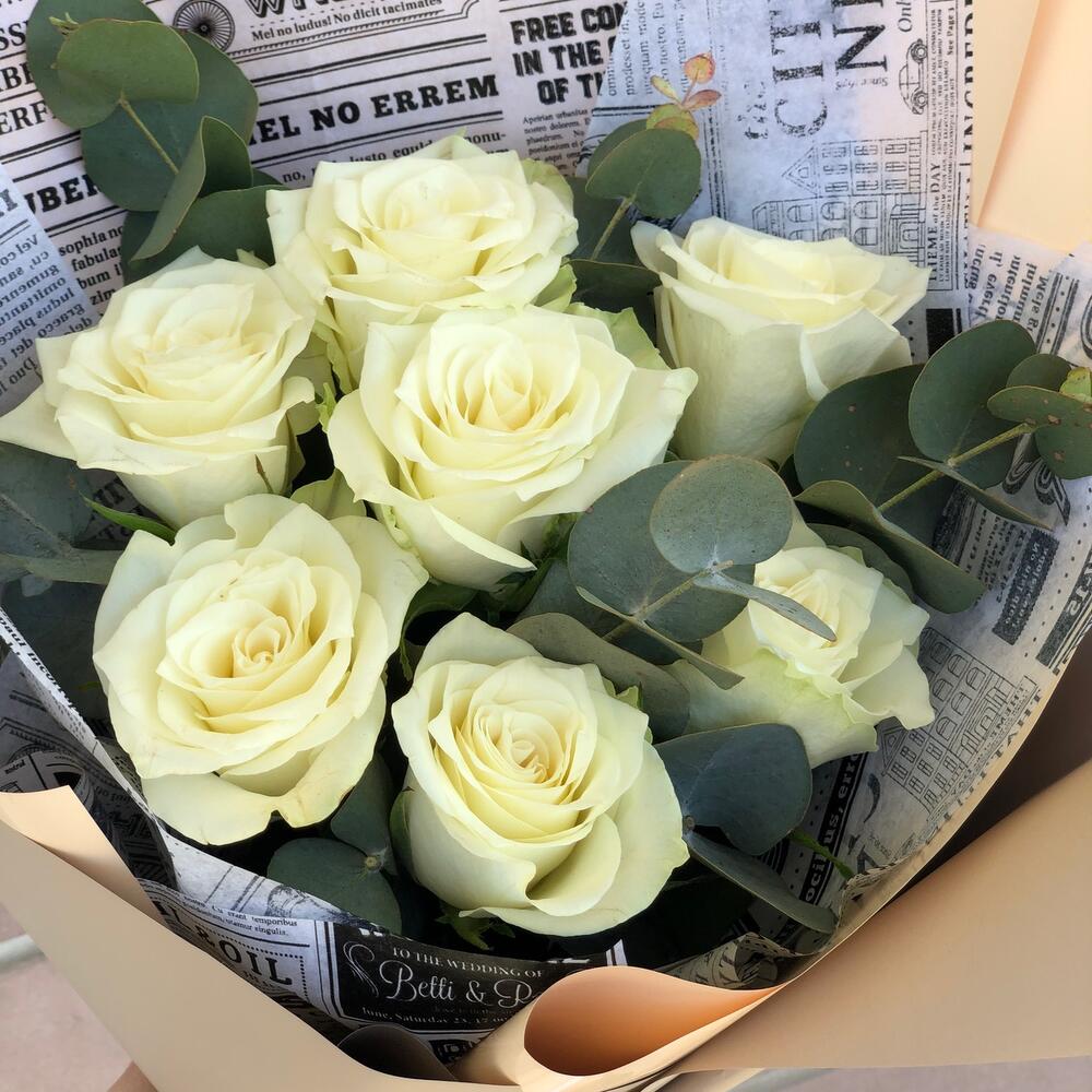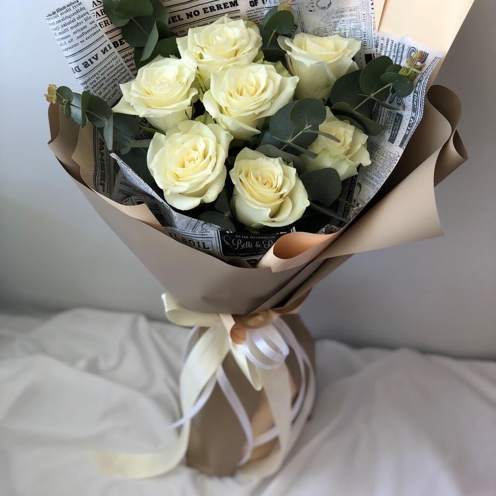 Белые кенийские розы с веточками эвкалипта в стильном оформлении.