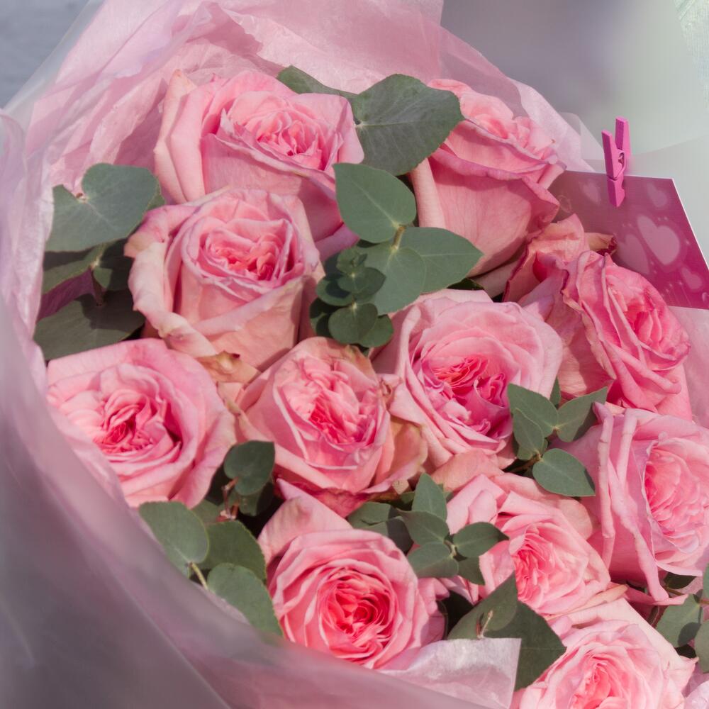 Пионовидная роза – 11 шт. Эвкалипт цинерария – 2 шт.