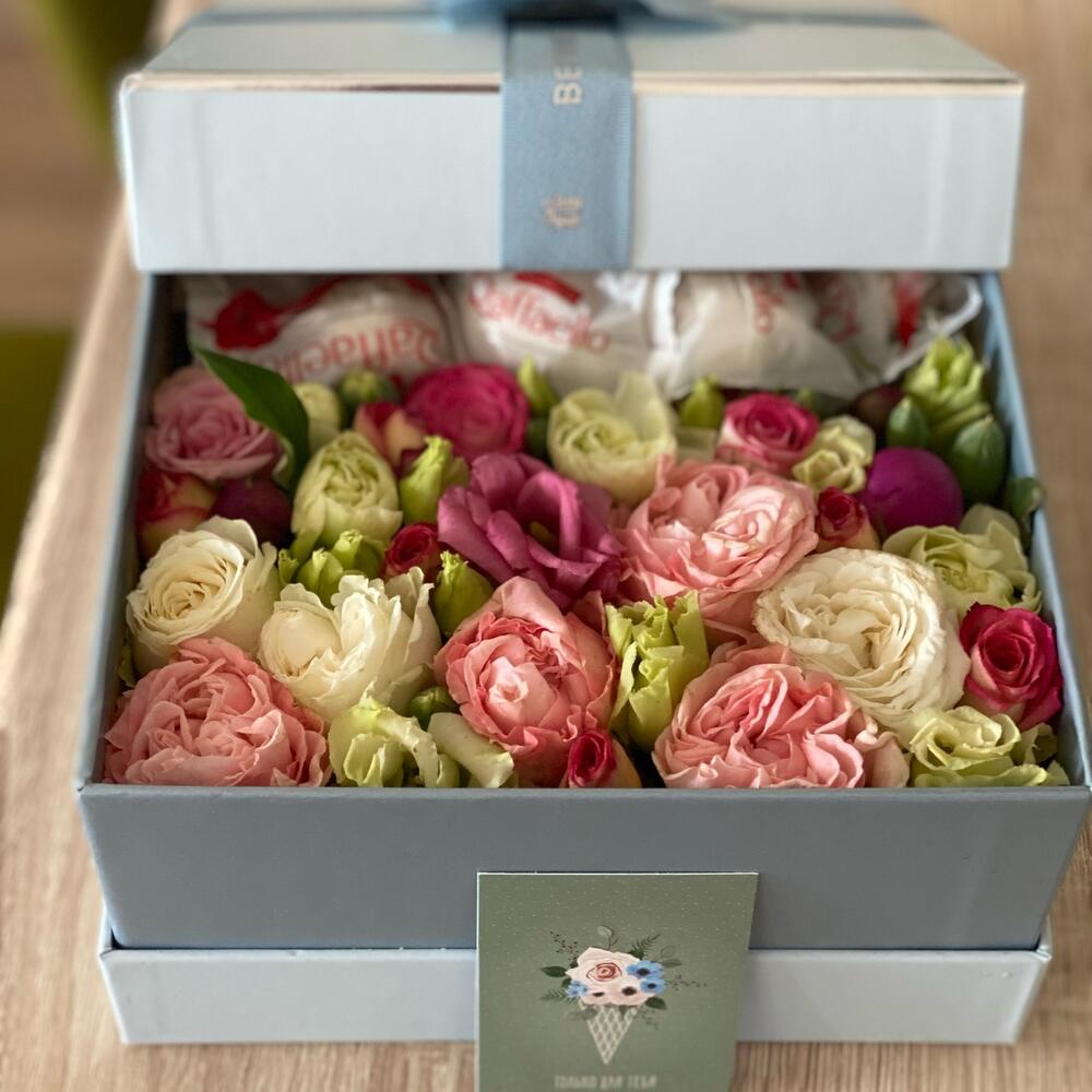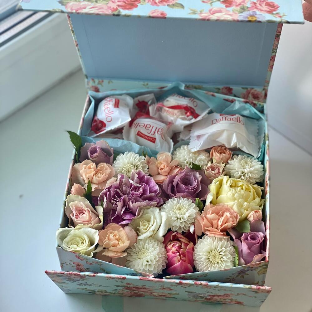 Цветы + сладости = идеальный подарок на любой повод дарения. Цветы в губке не требуют специального ухода, коробочка легко транспортируется и в дальнейшем может быть использования под другие цели.